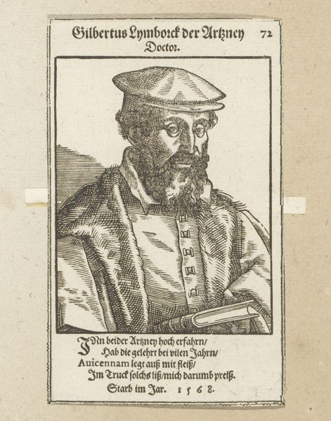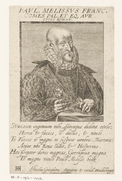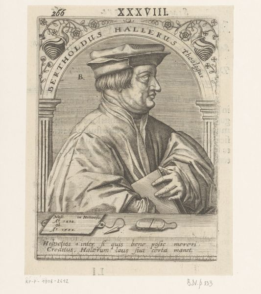 Curator: This is a print titled "Portret van Johannes Hus," made sometime between 1588 and 1622. The piece you see before you, held at the Rijksmuseum, is an engraving. Editor: It has a rather somber feel to it, despite its small scale. The subject is presented in profile, looking steadfast and thoughtful, but the grayscale tones create a sense of austerity. You almost feel as though he is looking to some tragic, invisible future. Curator: Absolutely. Engravings, by their nature, often lend themselves to such weighty feelings, and this portrait encapsulates that. Johannes Hus, a Czech theologian and philosopher, was a key predecessor to the Protestant Reformation. Look how deliberately he’s positioned with quill and paper. The image implies that Hus himself controls both the narrative and the religious future. Editor: That’s interesting. For me, it also begs the question about the printing and distribution process. I imagine that an image like this could have quickly spread and become somewhat iconic in certain reformist circles. The relatively easy reproduction that’s implicit in the work affects the status of Hus himself. I wonder about the skill and labor required to carve all those delicate lines to produce the engraving? Curator: The text, “IOAN HVSSVS, MARTYR CONSTANTISSIMVS,” signals exactly what function the work was meant to fulfill—ensuring the perseverance and martyrdom of Hus in collective memory. His clothing suggests status but without excess; more intellectual than lavish. And while austere as you pointed out, it does still represent continuity through very powerful images. Editor: Right, and thinking about this "memory," I wonder about the cost, availability and reach of a printed work like this versus a large painting on a wall. You can own a small work and carry it with you, like a relic. Curator: It speaks volumes, doesn’t it? Editor: Yes. Examining its materiality and considering its reception makes you realize it holds incredible power in shaping narratives across time.