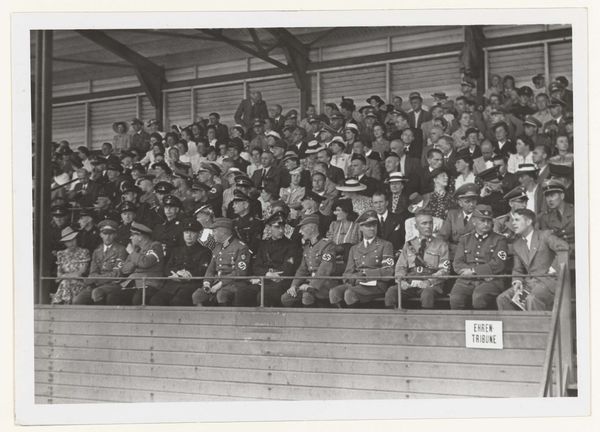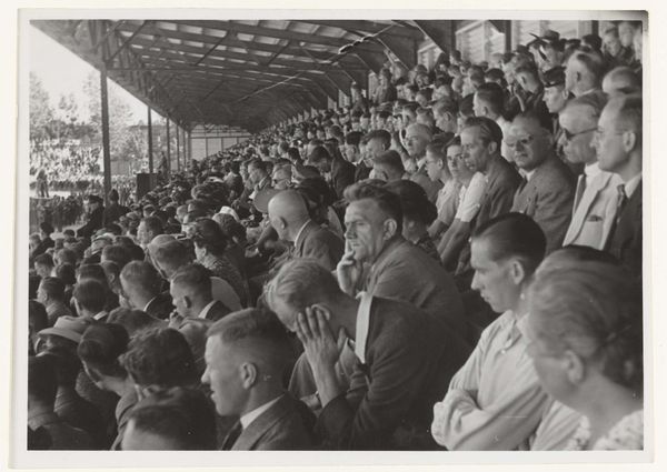 Editor: This photograph by Cas Oorthuys, possibly taken between 1945 and 1948, captures the "First National Liberation Celebration in the Olympic Stadium." The rows and rows of faces create an intense feeling of community. What significance do you see in this composition? Curator: This image presents a powerful symbol: a visual archive of collective memory. Beyond the documentary aspect, what lingers is the contrast between the visible joy of liberation and the implied suffering preceding it. The black and white tones mute the present, elevating it to the realm of iconic remembrance. Does the photographer's choice of capturing the elites on the tribune change your interpretation? Editor: Absolutely. Knowing that it depicts prominent figures affects how I perceive the celebration. It feels more controlled, a structured form of joy, less spontaneous. I am curious if the presence of officials influences the photographer's composition, creating a controlled narrative? Curator: Oorthuys was likely aware of their presence and influence. The rigid lines of the tribune are cleverly juxtaposed with the soft, human faces, a constant visual tension. It forces us to consider the roles of those who govern and those who are governed in shaping national narratives. Is the crowd's implied gaze as significant as what is seen in the faces of the dignitaries? Editor: That is a perspective I hadn't considered before. Thinking about what both the photographer and the subjects wanted to convey opens a lot of avenues. Curator: Precisely! Photography like this offers us glimpses into cultural attitudes towards leadership, freedom, and the very act of remembrance. A window to reconstruct a country's mindset and emotional condition. Editor: This really shifted my perspective. It is more than just a picture of a celebration; it’s a layered depiction of a society processing a monumental shift.