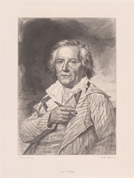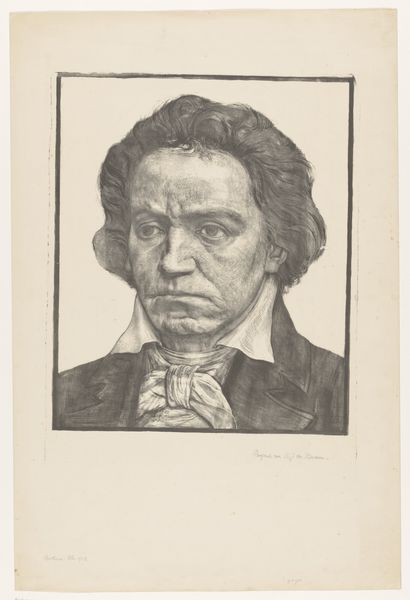 Curator: The somber mood radiating from Rogelio de Egusquiza’s "Portrait of the Artist Francisco de Goya," completed in 1902, immediately grabs you, doesn't it? It's as if a shadow of the soul is laid bare with charcoal and graphite. Editor: It's striking how the drawing conveys the weight of history, both in terms of Goya’s legacy and the act of portraying such an iconic figure. What socio-political narrative did Egusquiza wish to convey by portraying the famed painter? Curator: Well, he certainly captures a deep intensity in Goya's gaze, a life lived fully. The artist peers out as if confronting not just Egusquiza, but us, the viewers, across the centuries. There's a real sense of drama in those eyes, that untamed hair. You can almost hear him thinking rebellious thoughts. Editor: Absolutely. The raw emotion in Goya’s expression, accentuated by the chiaroscuro effect of the medium, speaks to the era's embrace of Romanticism and its exploration of individual psychology. It prompts questions about artistic genius and the impact of their socio-political environments on such creators. Curator: And isn’t there something almost touchable about the rendering of the white scarf? The contrast with the darker elements makes it seem like it’s radiating an inner light, which contrasts powerfully with the gloom that surrounds it, as if illuminating a fragment of the psyche. A delicate island within the tempest of thought, wouldn't you agree? Editor: I do, but I find myself thinking of the power structures inherent in the act of portraiture itself. Here, one artist interprets another, and we are left to negotiate the layering of those gazes, histories, and intentions. It prompts thinking about agency, visibility, and representation—who is seen and how? Curator: You always bring such thought-provoking ideas to our discussions! Ultimately, isn't it about how we connect to these representations across time and what whispers they spark in our own spirits? Editor: Precisely. The drawing’s ability to activate critical questions regarding the art world, artistic expression, and socio-political forces makes it incredibly powerful. It truly is an exceptional, resonant creation.