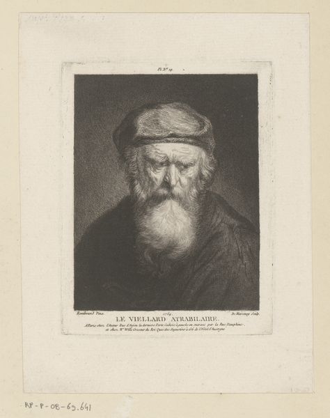 Curator: This engraving from between 1764 and 1765, currently held in the Rijksmuseum collection, is entitled “Buste van een oude man met baard, naar links gekeerd,” or, in English, "Bust of an old man with a beard, turned to the left". It was created by François Robert Ingouf. Editor: My first thought? Quiet contemplation. Look at the detail in that beard! It feels like the kind of image that invites you to lean in, observe closely, and perhaps get lost in thought. Curator: Precisely! Ingouf, working within the Baroque tradition, was particularly skilled at capturing textures and emotional depth, which makes engravings like this one quite compelling, even now. Editor: Definitely! Baroque often has this grandiose flair, but here it feels distilled, almost intimate. His gaze isn’t directly at us; it’s directed inward, carrying a heavy, history. And the medium – engraving – it feels so perfectly matched. Curator: Absolutely. Consider how printmaking at this time would democratize images. Ingouf ensured the image carries a certain gravitas that also felt relatable – hence the intimate feel of the work you identified. It becomes accessible on multiple levels. Editor: I also keep coming back to the cap on his head. It signals modesty, perhaps wisdom gleaned over time? Or just plain practicality. You know, keeping the head warm? Curator: The headdress could signify many things. Perhaps an identifier of status, faith, or vocation lost to us now. The beauty of this piece, and the beauty of images and symbols through art in general, is that their significance shifts as cultures evolve and change. Editor: Indeed! What stays is how they manage to provoke some reflection in the viewer, long after they've looked away. Curator: A reminder that we, too, are subject to such ever-shifting meanings. Editor: Right! Even if our beards may not measure up to this man’s!