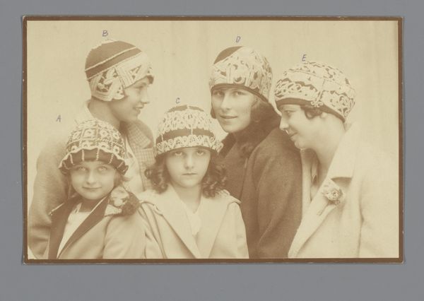 Curator: This photograph, currently residing here at the Rijksmuseum, showcases "Three Models Wearing Embroidered Dresses, Shawls, Coats and Hats from the Wiener Werkstätte." Its creation falls roughly between 1920 and 1930. Editor: The image, bathed in sepia tones, initially whispers of gentle melancholy to me. The models, seemingly captured mid-pose, create a feeling of almost vulnerable stillness. Curator: Those clothes! The Wiener Werkstätte was, of course, about so much more than mere fashion. Each stitch, each embellishment tells a story of artistic intention. Look at the geometry interwoven with floral motifs, hinting at a fusion of the modern and the timeless feminine ideals. The weight of the materials clearly contributes to their presentation as art pieces. Editor: Absolutely, the texture seems palpable even through this photographic filter. And I am struck by the artistry implicit in these embroidered works, each knot and loop representative of unheralded craftswomen—a potent symbol of labor that brought beauty into being and also helped challenge the traditional boundaries of domestic work versus studio artwork. Curator: The models themselves seem to embody a certain spirit, their gaze carrying an echo of hope. It is interesting that it seems posed with great awareness, as it feels more staged and constructed rather than truly candid or naturalistic, yet they almost break this impression due to the faintness of the smiles on their faces. The caps almost remind me of halos, albeit subdued. Perhaps signaling purity but also vulnerability? Editor: Yes! Purity as labor, I suppose—and labor as a mode of social distinction in the 1920s-1930s, not that far removed from when photography developed more thoroughly as a mass phenomenon of capturing images and promoting commodity consumption. Think about it—the photograph is a document of clothes, clothes are signifiers of material and means of production and class aspirations. Curator: That interplay, that push-and-pull between image and industry... that is where the soul of art often reveals itself. The Wiener Werkstätte has proven to be just a blip in the fashion world, yet its symbolism, through an image such as this, lives on as a testament to craftsmanship and creativity. Editor: And to labor’s central role, always implicated. Thanks for pointing this out to me. I have gained new admiration for all that is communicated and revealed.