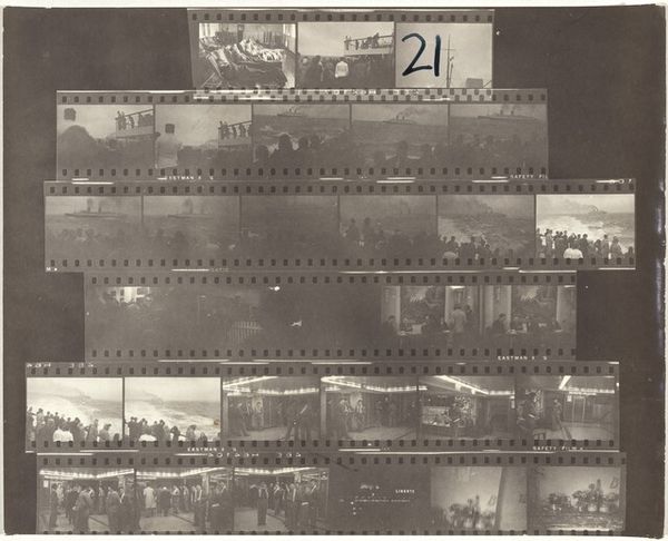 Robert Frank created "Paris 24B" using photography, presenting a series of film strips arranged on a dark background. The high contrast between light and shadow immediately evokes a sense of urban isolation and introspection. The film strips themselves, with their sprocket holes and frame edges, emphasize the mechanical nature of photography, reminding us that what we see is a construct, a selection from the continuous flow of time and space. Notice the number "24" scrawled across one strip, possibly a reference to a sequence or project number. The composition is fragmented, mirroring the disjointed experience of modern life. Frank invites us to question the relationship between image, reality, and memory. The film's materiality, combined with Frank's snapshot aesthetic, challenges traditional notions of photographic representation and narrative coherence. In this way, the artwork operates as a commentary on the nature of seeing and remembering.