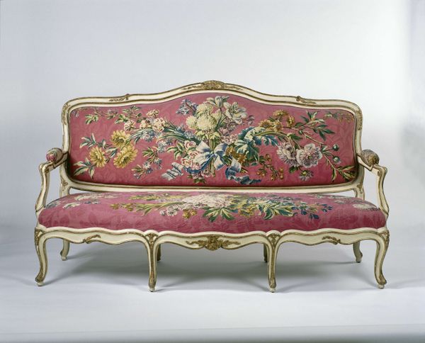 This is an armchair upholstered with tapestry depicting bouquets of flowers, created by I. Gourdin. The chair presents a formal elegance through its carefully considered composition and the interplay of materials. The curvilinear frame, finished in a delicate white with gilded accents, contrasts beautifully with the plush, tapestry fabric. The tapestry, dominated by a muted pink, features dense bouquets that create a visually rich surface. The arrangement of the flowers and the way they are tied with ribbons draws the eye to the centre of the chair, establishing a focal point. The structural integrity of the chair is not merely functional; it’s a statement of the period’s aesthetic values, which prioritized ornamentation. The chair acts as both a functional object and as a canvas for elaborate decoration. Each curve, each stitch, and each floral motif contributes to its signification of luxury. The chair invites reflection on the cultural codes and artistic conventions of its time. It makes us think about how the chair engages with themes of nature, artifice, and the domestic sphere.
