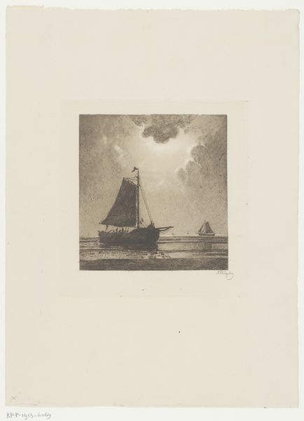 Philip Little created "Wing and Wing," an etching, capturing a maritime scene in muted tones. Born in 1857, Little lived through a period of rapid industrialization in America and the rise of modern artistic movements. The composition of the artwork evokes a sense of tranquility and perhaps, nostalgia. The choice to depict sailing vessels, rather than steam-powered boats, may reflect a yearning for a simpler, pre-industrial era. We can consider this artwork as a meditation on humanity's relationship with nature, and the emotional connection to maritime life. The print invites a conversation about the cultural constructions of masculinity, labor, and leisure. The sailors embody traditional ideals of manliness through their work. The scene, however, also has a romantic, dreamlike quality, softening the harsh realities of maritime labor. The reflections of the ships in the water create a mirrored image, perhaps suggesting that our perception of the world is often a reflection of our own desires and memories. The artwork is deeply personal, yet resonates with larger societal themes of progress, memory, and identity.