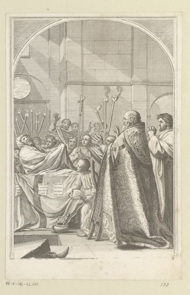 Pieter de Jode II created this engraving, Plate 24: Charles V crowned Emperor by the Pope, in the 17th century. It illustrates a moment of high political and religious drama. The image is part of a series of prints intended to celebrate the reign of Ferdinand, the Infante of Spain, and to legitimize the Habsburg dynasty's power by linking it to historical precedents. The print is striking for its depiction of power dynamics, especially the relationship between the church and state. Charles V kneels submissively as the Pope places the crown on his head, suggesting the church’s authority over even the most powerful secular rulers. This was a period marked by religious conflict and political maneuvering, where the divine right of kings was often invoked to justify power. Consider how images like this were used as propaganda. They shaped public perception of rulers and reinforced the existing social hierarchy. The emotional impact lies in the portrayal of legitimacy and divine approval, meant to inspire awe and obedience. The careful composition and detailed rendering serve to enshrine a particular narrative of power.