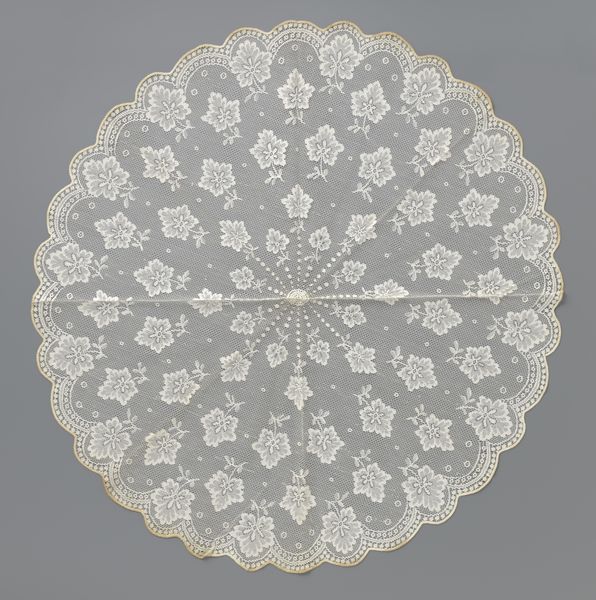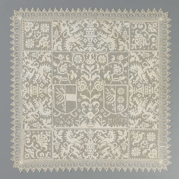 Curator: This delicate artifact is a lace handkerchief, crafted around 1840. The fine needlework features the combined coat of arms of the Netherlands and Württemberg. Editor: It’s breathtaking. Such intricate detail evokes a sense of quiet luxury, of personal care and almost obsessive refinement. The repeated motifs give it a mesmerizing quality. Curator: Precisely. The batiste fabric and the complex lace-making technique are integral to understanding its visual impact. Note the contrast between the solid central panel and the openwork border, directing the eye outward. Editor: And those borders tell such a layered story. The interweaving of heraldic symbols and floral patterns suggests a celebration of both power and nature—a harmonious, if idealized, worldview. The crown, for instance, sits comfortably among roses and ferns, as if to naturalize authority itself. Curator: An insightful observation! The piece plays with texture through contrasting densities of pattern. Observe the geometric fills and the scrolling botanicals juxtaposed; each element functions independently while contributing to the whole. Editor: This contrast adds a layer of social meaning as well. It speaks to a desire to present a refined identity, associating oneself with noble lineages and also cultivating cultivated tastes in floral design, for example. It becomes a sort of visual performance of status. Curator: Indeed, the handkerchief embodies the material language of status. Its effectiveness lies not just in its functionality, but its symbolic display through expertly applied needlework and materials. Editor: Looking at it, I am struck by its enduring appeal. While fashions change, the symbols woven into the piece represent core beliefs about family, power, and beauty. It's a tangible piece of history in miniature, preserved within the threads of this handkerchief. Curator: A perfect summary. Its enduring elegance stems from an acute mastery of composition and meticulous execution, highlighting both intrinsic aesthetics and cultural coding of its time. Editor: Agreed, its legacy is how material interacts so fluently with symbolic language and transmits its significance across centuries.