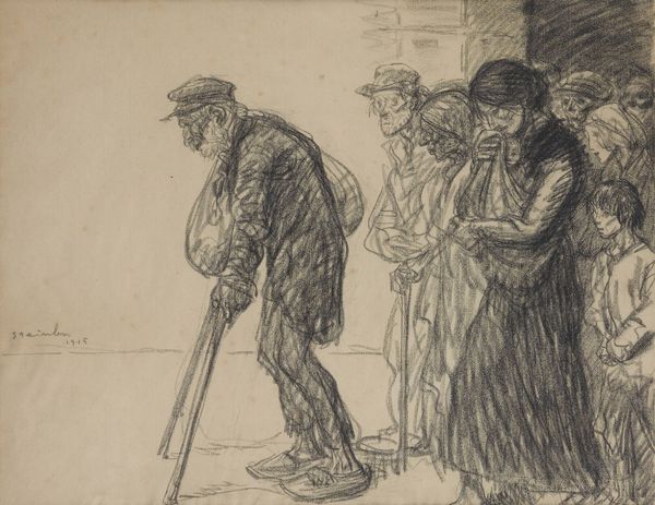 Editor: This is "Straattafereel in Londen," a street scene in London, created by Jan Toorop in 1888 using charcoal and pencil. It strikes me as quite somber; the people seem downtrodden and weary. What do you see in this piece, especially considering its historical context? Curator: The drawing offers a powerful commentary on the social realities of London in the late 19th century. Toorop, influenced by the realist movement, isn’t just depicting a scene; he’s inviting us to confront the harsh conditions faced by the working class. Notice the uniformity in dress and posture? This emphasizes a shared experience of poverty and hardship. How do you think gender and class intersect here? Editor: I notice most of the people are women and children, and their expressions seem filled with anxiety. Does this relate to societal roles during that era? Curator: Absolutely. Women, particularly mothers, often bore the brunt of economic instability. Consider the period’s debates around labour laws, women's rights, and the visibility of poverty. The cityscape backdrop isn’t just scenery; it's an indictment of urban inequality, linking personal suffering to systemic issues. Does knowing this influence your interpretation of the drawing’s mood? Editor: Definitely. It transforms from a simple depiction to a powerful social statement. I see now that it's more than just somber; it's a call for awareness. Curator: Precisely. And it’s a reminder that art can be a potent tool for social change, encouraging viewers to reflect on the uncomfortable truths of society, then and now. I think looking at how labor is valued, commodified, or invisibilized today helps keep Toorop’s vision current. Editor: That's given me a new way to appreciate not just the artwork itself, but the historical struggles it reflects and the contemporary issues it echoes. Thanks! Curator: A critical perspective helps make these older works speak to modern issues; they take on new life, new meanings. It works both ways; history helps shed light on today's urgent cultural, social, and political landscapes.