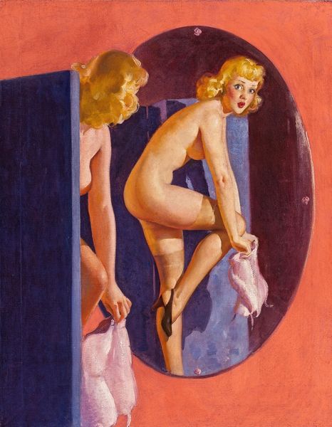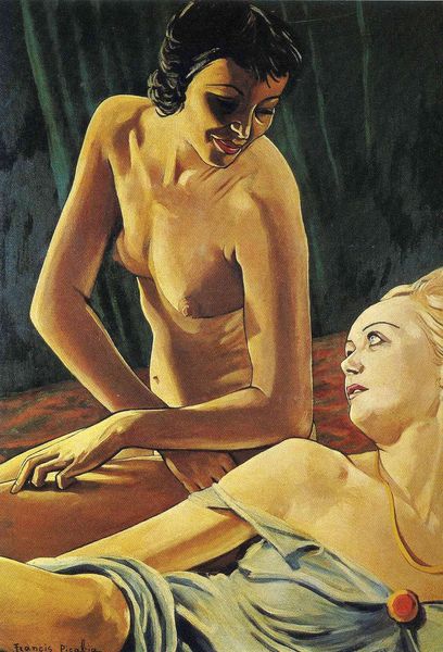 Curator: So, what catches your eye first in this Picabia? This oil on canvas from 1942, entitled "Women and Bulldog," feels... unexpected. Editor: It has this slightly unsettling, voyeuristic quality. The awkward posing and blatant eroticism almost feel performative. It's very loaded. Curator: "Loaded," yes, precisely! It's as though Picabia's throwing every taboo in the mix. Nudity, a sense of confined intimacy, and a languid bulldog at the bottom of the composition… it’s almost laughable, isn't it? Editor: Right, and those classical, almost academic nudes feel strangely out of place amidst the context of modernism. Is it commentary on beauty standards, the male gaze, or is Picabia merely reveling in objectification? Curator: Well, he was always something of a provocateur, our Francis. I sense a critique of bourgeois society lurking beneath the surface, along with, frankly, a dollop of cynical humor. It is clear he wants to push buttons. But he also has his own visual language—all those layers of reference! Editor: I agree, the way he references art historical styles creates a clash. It reminds us that this painting emerges during wartime. The presence of the two women almost makes it feel as if they are offering each other comfort while confronting very delicate gazes. Curator: A shelter from the storm, perhaps. Or maybe it's simply Picabia, the trickster, leading us down a garden path of our own projections. The details like the floral decoration in the corner juxtapose against the gridded window in the other, symbolizing imprisonment. Even the color palette contributes to the overall effect—those saturated blues and skin tones creating a certain kind of mood. Editor: And yet the gaze lingers…It is so captivating despite its flaws and complications. There are clearly so many questions asked within this singular picture that still demand a response. Curator: Ultimately, it feels like Picabia has gifted us with a puzzle. Each element of this work feels deeply considered and yet also feels like it doesn’t resolve! Editor: A puzzle, absolutely. One that reflects the convoluted politics of representation, intimacy, and pleasure—or, sometimes, the complete lack thereof.