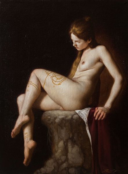 Christen Købke painted "Nude Figure. Sitting Boy" with oil on canvas. The artwork presents a study of a nude male figure seated on a wooden chest, rendered in a palette of muted tones. The composition, dominated by the subtle interplay of light and shadow, directs our attention to the textures of skin and wood. Købke's approach to realism here is striking. The figure's pose, with one leg drawn up and arms extended, creates a dynamic tension within the frame. This is not simply a portrait; it's an exploration of form, musculature and the subtle gradations of light across the human body. The simplicity of the background and the artist's close attention to detail invite us to consider the structure of the human form. The lack of idealization situates the work in a broader dialogue about representation and authenticity. The painting serves as an exercise in perception. It compels us to contemplate the relationship between seeing and knowing. It highlights the role of art in shaping our understanding of the human experience.