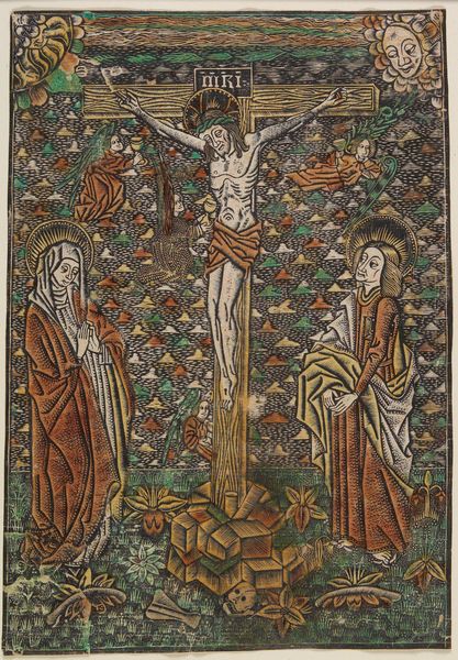Curator: Before us, we have an early watercolor print, “Christ on the Cross,” dating back to around 1460 by an anonymous artist. Editor: It’s quite small, isn't it? Almost feels like a personal devotional piece. And immediately, I'm struck by how the materials betray a certain rawness—the way the color bleeds. Curator: That rawness lends itself well to the spiritual tenor. Notice the positioning of the Virgin Mary and St. John the Evangelist at the foot of the Cross, they exemplify the collective mourning of humanity. Their halos act like spiritual signifiers. Editor: And how are these pieces made? The texture seems uneven; tell me, were such prints widely available at this time, impacting popular devotional practices through reproduced imagery? How was labor distributed in their production? Curator: It's possible it was part of the block book phenomenon, which means each page, text, and image, would have been carved from a single block. And the imagery? It follows established visual tropes. Christ’s wounds, for example, were specifically invoked during times of the Black Death as intercession to God. Editor: So, a potent object. The image, cheaply and easily reproduced, served to soothe societal anxiety through a focus on sacrifice. Were the artists recognized as skilled craftsmen, or merely anonymous facilitators of a message? I'm curious how the production mirrors the hierarchical society from which it came. Curator: The fact that the artist is anonymous makes it even more significant because it points to collective consciousness during the medieval period. It becomes less about individual genius, and more about the symbolic power of the image itself and the faith of the population. Editor: I see your point. And though my interest stems from the materiality of its production and consumption, the image succeeds as a tangible item for solace in troubled times. It’s a remarkable synthesis of making and meaning. Curator: Yes, it speaks volumes about the cultural currents of its time. A piece with a humble presentation, perhaps, but monumental implications.