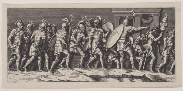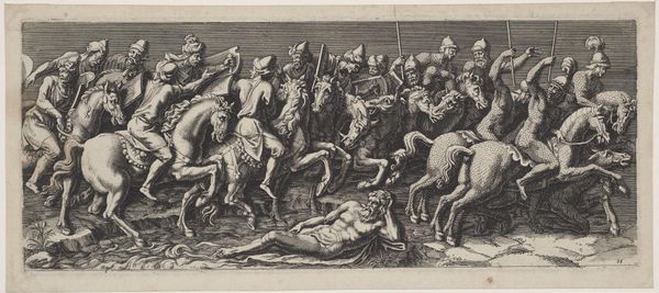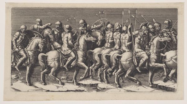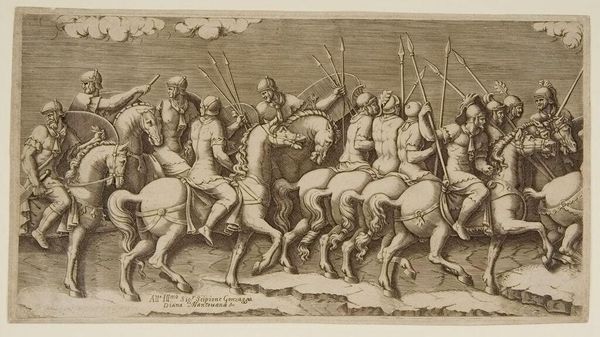 Diana Mantuana etched this print of armed horsemen sometime in the late 16th century. Here we see a long procession of soldiers on horseback, each figure rendered with remarkable detail and dynamism. The horse, a powerful symbol across cultures, represents strength, nobility, and freedom. The procession itself is a motif that appears in numerous historical and artistic contexts, from triumphal entries of Roman emperors to medieval tapestries depicting royal pageants. Consider the recurring image of the mounted warrior throughout history. From the equestrian statues of antiquity to the Renaissance paintings of triumphant knights, the figure embodies authority, power, and martial prowess. This image, deeply embedded in our collective memory, evokes a sense of awe and respect, but also perhaps a primal fear of domination. As the procession moves, the echoes of countless historical journeys resonate, reminding us of the cyclical nature of power and the enduring human fascination with spectacle and strength.