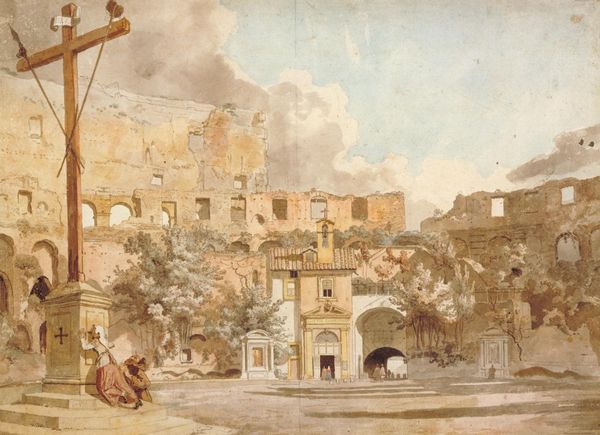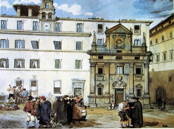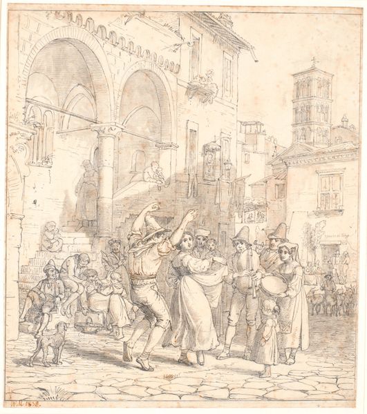 Editor: Here we have Achille Pinelli's "San Dionigi alle Quattro Fontane," created in 1833. It’s a watercolor that gives off a sort of bustling, almost theatrical vibe. So many figures in traditional costumes fill the foreground of the stoic building. What catches your eye about this piece? Curator: You know, when I look at this, I feel like I’m peering through a time portal. Pinelli was quite the storyteller, wasn't he? I imagine him setting up his easel right there, in the midst of the lively Roman street scene, capturing the dance between everyday life and the imposing architecture. The watercolor almost seems to hum with the sounds of celebration, maybe a local festival? And see how the people sort of emerge out of this monochromatic architectural landscape. Does the building fade from your eye the longer you view the work? Editor: It does, actually! I was so focused on the figures. What's the deal with depicting daily life during this time, in art? Curator: Good question. Genre painting became super popular during the 19th century, almost like the Instagram of its day, you know? These scenes offer us candid glimpses into how people lived, what they wore, how they celebrated. They documented a moment in history. So what are your thoughts about how accurate that document feels, seeing that this might be idealized, romanticized or editorialized? Editor: That’s a perspective I hadn’t fully considered. It prompts me to delve deeper into the story behind the image. The "warts and all" that aren't included give me pause. Curator: Exactly! And doesn’t it make you wonder what *isn't* shown? The whispers behind the laughter, the shadows beyond the celebration. It's like art holding a mirror up to life… a very selective, slightly smudged mirror. It makes us ask, "What is this artist really showing, or not showing, us?" Editor: That makes you think differently about documentary, then. Food for thought! Curator: Indeed! It's what makes art so endlessly engaging – peeling back the layers, one brushstroke at a time.