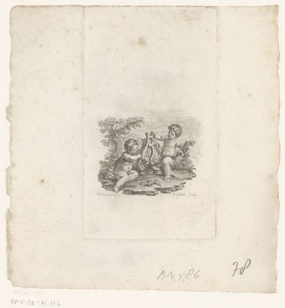 Editor: This print, “Drie putti met boeken en een lauwerkrans,” or “Three Putti with Books and a Laurel Wreath” by Benoit Louis Prevost, dating from 1757 to 1809, is deceptively simple. At first glance, it's just cherubic figures. How should we interpret it? Curator: Consider the material conditions that enable its existence. Engraving is a reproductive medium. The question is, what social function did disseminating images of leisure and learning serve in the 18th century? Who consumed this, and what was its value, both cultural and economic? Editor: So, it's not just about the cherubs; it's about how the print-making process allowed this image to be circulated, perhaps even commodified? What was the labour involved? Curator: Exactly! The engraving process itself is crucial. The artist-engraver’s skilled labor transforms an idea into a tangible object, an item for consumption and dissemination. Were these mass-produced or exclusive to a privileged class? What impact did Neoclassicism have? Editor: Right, the Neoclassical style implies certain values about knowledge and art. So, by reproducing this image through printmaking, Prevost was making those values accessible, or at least visible, to a wider audience, perhaps shaping their understanding of education and art? Curator: Precisely! We have to investigate further the distribution network and reception of such prints during that era to fully grasp its significance. Were these prints part of a larger publishing venture? Did they accompany books? Editor: That really shifts my understanding. It’s less about the classical subject matter and more about how the *production* of the print changed its function within society. Thanks, this gives me a lot to consider. Curator: Indeed, examining art through the lens of production, labor, and circulation offers a unique insight into its historical role and influence.