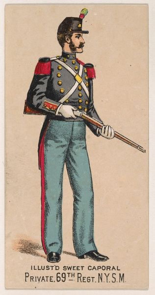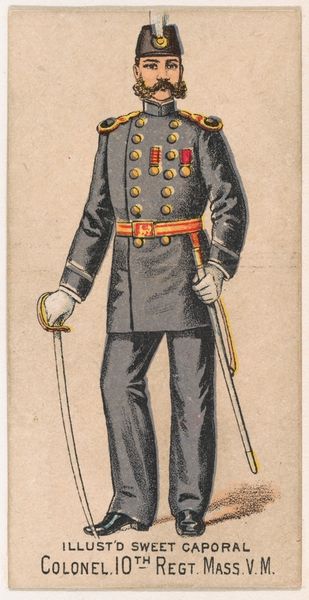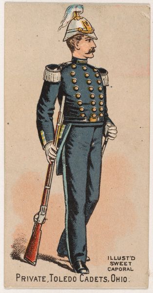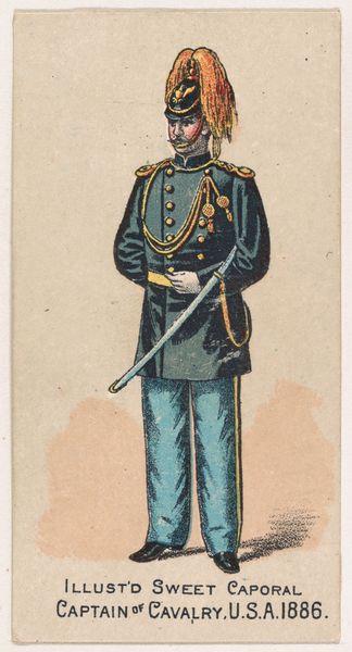 The Kinney Brothers Tobacco Company created this small lithograph, "Officer, Rhode Island State Militia," around 1888, as a promotional item for Sweet Caporal Cigarettes. Far from traditional art materials, this print was a mass-produced artifact, reflecting the rise of consumer culture. The chromolithography process allowed for vibrant colors and multiple impressions, churning out images at an unprecedented scale. Consider the labor involved: from the artists creating the original design, to the factory workers operating the lithographic presses, to the tobacco farmers growing the raw materials. These cards were not just images; they were products of a complex network of industry and commerce. Though small in scale, this card speaks volumes about the changing landscape of art, labor, and consumption in the late 19th century, challenging our notions of artistic value and reminding us that even the humblest objects can hold profound cultural significance.