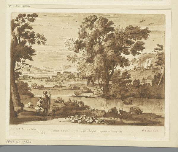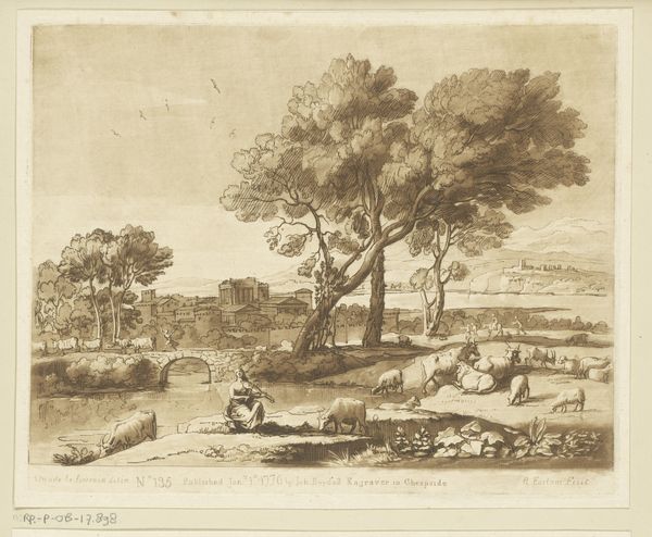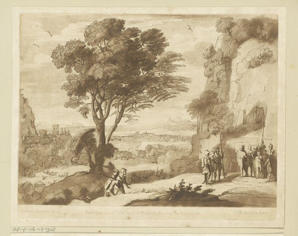 Editor: Here we have Francesco Zuccarelli's "Landscape with a Bridge," created around the mid-18th century using pencil, paper, and watercolor. It has such a serene and staged quality to it. What stands out to you when you look at this piece? Curator: Well, it's important to recognize how Zuccarelli situates this idyllic scene within the context of the Grand Tour. Think about wealthy Europeans, primarily British, traveling to Italy to absorb culture and antiquity. This drawing isn't just a landscape; it's a carefully constructed representation of what they sought to find and collect: picturesque views filled with classical references. Notice how the architecture and even the poses of the figures seem to borrow from established artistic conventions. Editor: So it's less about capturing a specific place, and more about fulfilling a particular expectation? Curator: Precisely! The Italian landscape became a consumable commodity, reflecting specific social and cultural aspirations. How does the scale influence this perceived message? Editor: Knowing that this artwork may have been acquired, perhaps as a souvenir, does invite one to think about the art market back then, how artists shaped perceptions of beauty and historical relevance, and to reflect upon who got to participate in it. The act of acquiring the art reinforces the status of those who travelled. Curator: Indeed. The drawing functioned almost as a validation of their journey, proof of their cultural refinement, and participation in a specific societal trend. These images perpetuated a narrative, controlling the representation of Italy for external consumption. Editor: I see it now. The artistic skill is undeniable, but its historical context is vital to fully appreciate the cultural impact this artwork embodies. Thanks! Curator: Absolutely! It’s the interplay between art and its reception that truly fascinates. Examining artwork in social contexts has made me think about travel and consumption then and now.
