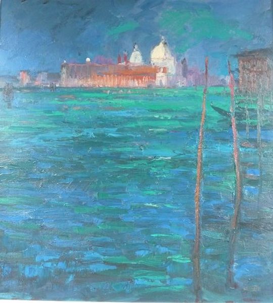 Curator: Before us hangs Samuel Mutzner's "Veneția," an oil painting from 1928. Mutzner, active in the early 20th century, captured in this work, I believe, not just a city, but a feeling tied to place and time. Editor: It’s quite evocative, isn't it? The brushstrokes, thick and almost hurried, really seize that fleeting Venetian light. It has a palpable, almost melancholic mood for me. Curator: Yes, there's a dreamlike quality evoked, especially in the depiction of architectural forms. Consider Venice, often romanticized yet built upon complex trade routes and, indeed, exploitation. Editor: I can see how you read that narrative into it. For me, it's in the juxtaposition of solidity and transience; look how the heavy, almost sculptural column anchors the composition, versus the light brushwork in the clouds, capturing a fleeting moment. It’s beautiful. Curator: Precisely. Venice, historically a nexus of trade and cultural exchange, also represents a site of encounter and perhaps, even conflict. Mutzner positions figures here, dwarfed, almost like observers within a grand historical drama. We have, after all, the silhouettes of tourists and local individuals on that landing at the end of the canal... the economic relationships at play... Editor: I agree that these human figures, with their limited form, give us something of scale—but it is also a technique in composition and design. It heightens a sensation of depth. My focus would still rest more on the brushstrokes themselves, creating shimmering visual patterns across the canvas. Note, too, how they echo elements such as water and air. Curator: Ultimately, I think that, by observing the work, and by extension Venetian history through the lenses of colonialism, and even ecological concern, we may more thoroughly consider its meanings. Editor: Agreed! I found myself swept away in how Mutzner balanced form and texture, capturing the city's timeless beauty through sheer technical skill. It is, perhaps, in those brushstrokes, we too can capture something significant in our observations.