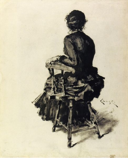 Editor: Here we have Vasily Polenov’s "Portrait of N. Yakunchikova," an oil painting made with watercolor from 1882. The muted colors create a rather somber mood, don't you think? How do you interpret this work, focusing on its form? Curator: The success of this painting lies primarily in Polenov's handling of light and form. Note how the overall composition is structured by contrasting blocks of tone: the dark greens and blues of the subject's clothing against the faded light yellow wall. Where do you think the artist is attempting to draw our eye first? Editor: I suppose the eye goes to the painterly area to the left of the figure, where the darkness is thickest and most contrasting with the wall, although the figure painting feels equally important, too. How does the balance function overall? Curator: It functions through asymmetry. See how the positioning of Yakunchikova slightly off-center generates visual interest. The soft gradations of color on the wall contribute a delicate atmosphere, playing off of the more rigid shapes in her easel. Furthermore, Polenov’s choice to leave parts of the paper untouched provides visual rest amidst all of the color variations. Editor: The untouched parts give the watercolor breathing room. It makes it feel light. It's as if Polenov is using negative space as an active element. I like how we’ve been able to really tease apart the relationship between all of its internal components. Curator: Precisely. We can truly grasp how the formal interplay generates and modulates meaning by looking intently at how different compositional elements cohere.