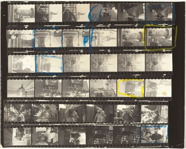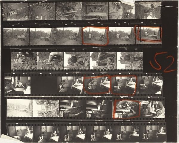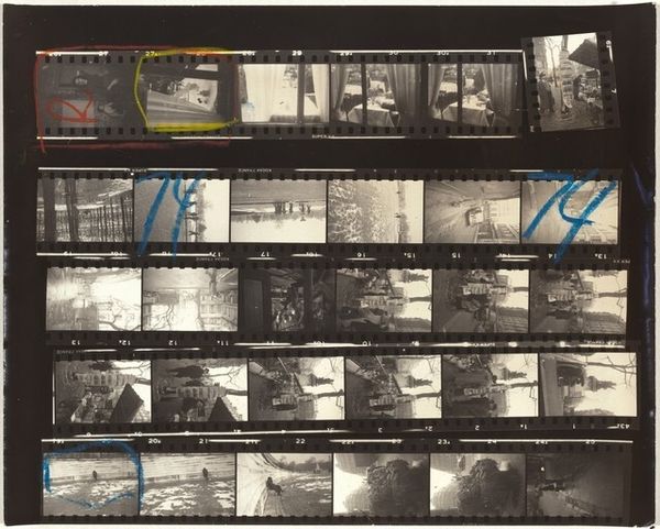 Curator: This is Robert Frank's "Paris 68B," a gelatin silver print made between 1951 and 1952. It offers us a glimpse into Frank's early exploration of street photography, long before his groundbreaking work, "The Americans." Editor: Wow, it's like stumbling upon a lost film reel! There's this raw, fragmented feel to it, almost like flipping through memories that are slightly out of order, you know? And the handwriting... adds this intensely personal touch. Curator: Precisely. The visible markings—the "68" scrawled across the images, the circled frames—offer insight into Frank's selection process, almost like a contact sheet brought to life. These details turn a mundane editing task into an active layer of the artistic process, laying bare choices often kept private. Editor: It’s strangely poetic, right? I’m catching glimpses of bustling cityscapes, fleeting portraits of Parisians. It's grainy, moody... you can almost smell the rain and cigarette smoke in the air. Did he manipulate these much in the darkroom or…? Curator: Frank’s approach was generally less about elaborate darkroom manipulation and more about capturing a certain social reality. "Paris 68B," even as a contact sheet, reveals the influences of postwar European photography, and his own growing style that emphasized raw immediacy. He aimed to present authentic moments, often focusing on ordinary individuals rather than iconic landmarks. Editor: Makes sense. The images almost seem like sketches… these fragmented moments that hint at bigger stories, more elaborate lives. Curator: Yes, there's this underlying narrative hinting towards themes that continued throughout Frank's career: the exploration of social tensions, individual alienation, and the gritty reality of urban life, rendered with a poignant and unflinching eye. Editor: So it's almost a precursor… like we're peering into the petri dish where "The Americans" was slowly grown? Curator: Precisely. It allows us to see Frank's eye developing, a sort of experimental laboratory of his approach, blending artistic subjectivity with documentary impulse. The medium of gelatin silver print highlights the subtle tonal range essential for portraying these nuances of urban life. Editor: Well, seeing these frames makes me appreciate how many unseen photographs lead to just *one* iconic shot. This is more like seeing the hidden map of someone else's thoughts, with those notations becoming their own piece of art. I think I prefer this fragmented realness to a polished piece. Curator: Indeed, “Paris 68B” challenges our notions of artistic intentionality and photographic perfection. This artwork reminds us that value also lies in artistic evolution.
