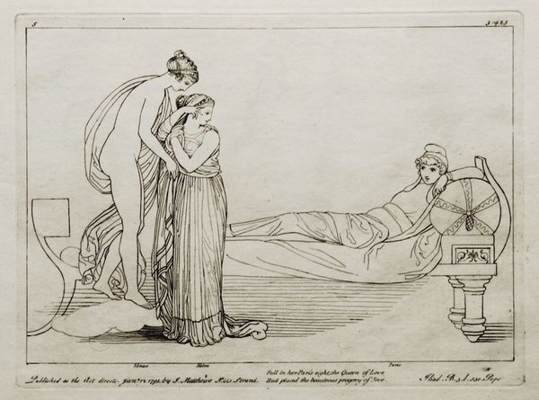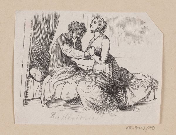 Curator: Oh, how sweet! There's an air of serene melancholy here. Editor: Indeed. This illustration by H.P. Hansen, dating from around 1870 to 1873, accompanies H.C. Andersen's "Fairy Tales and Stories," specifically the tale of "The Phoenix Bird". It is a print rendered with pen and ink, currently held at the SMK. It looks like a genre scene to me, miniature scale with line work typical of the Romantic style, which focuses primarily on narrative and figuration. Curator: I'm particularly drawn to the mother’s contemplative pose. She appears both present and utterly lost in thought while looking down at her peacefully sleeping infant, the rays shining out over it. But the light source does feel a little bit uncanny. What's with the beams? Editor: I see the radiance surrounding the baby less as light, but more as symbolic of something— the extraordinary, almost industrial attention the mother places upon her labor: her own child-making and its physical consequences! That line and pen would become associated with commercial printing a little while after the date that Hansen made this print makes it almost seem prescient, in this sense! The attention placed upon what is traditionally female work and subject feels radically updated when considered as just one of many commodities in a future marketplace. Curator: I can appreciate how the artistic execution reinforces themes present in Andersen's story. But isn’t the tenderness important too? I sense longing…maybe even fear that something so innocent might someday change. I mean look, it looks like an abandoned toy laying next to the cradle and her sewing kit and sewing resting idly. Editor: Ah, yes, perhaps the very act of portraying such delicate affection and innocent joy, here and now, becomes Hansen’s own phoenix call? In any case, I feel as though the materiality really serves this image well: there are stories held within. Curator: And isn't that always the case? What remains now feels…prescious. Editor: I completely agree. It leaves you pondering long after you've left it!