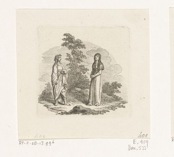 Curator: Johannes Steyn's print, “Man en jongen bij blinde man,” completed in 1836, is an intriguing piece in the Rijksmuseum's collection. Editor: My immediate impression is one of stark contrast. The clean lines of the engraving emphasize a division, both visual and thematic, between the affluent and the destitute. The use of hatching and cross-hatching creates texture, yes, but it also heightens the somber mood. Curator: Indeed. The image resonates with prevalent cultural narratives surrounding charity and societal disparities of the era. A well-dressed man and a boy offer alms to a seated, blind beggar, and this familiar subject speaks volumes. This harkens back to enduring representations of social responsibility, or lack thereof, playing on familiar symbolic tropes. Editor: Structurally, notice how Steyn uses the bordering frame to tightly constrain the narrative space, thereby accentuating the close quarters shared by these characters. This limitation echoes the social restrictions each faces. The strong verticals of the architecture further box the scene. Curator: Consider also the significance of blindness as a recurring symbol throughout history. Blindness represents ignorance, dependence, and vulnerability but it may symbolize also an alternative vision, one attuned to truths unseen by those with sight. The engraving invites the viewer to reflect on their own sightedness, to consider their understanding and compassion towards those perceived as "less fortunate". Editor: Precisely. Steyn crafts an internal triangle using the gazes and gestures of these three figures; this generates a visual tension which is amplified through contrasting light and shadow. It creates depth, literally and conceptually. Curator: We find familiar morality tales of the 19th century, rendered through accessible and readily understood visual language. It captures social tension and reflects anxieties about poverty and dependence, that continues even now. Editor: In the end, the print masterfully communicates not simply a scene, but a dynamic, a silent narrative pregnant with implied meaning and cultural resonance; Steyn invites a conversation—a discussion prompted by a precise and formalized set of aesthetic choices.