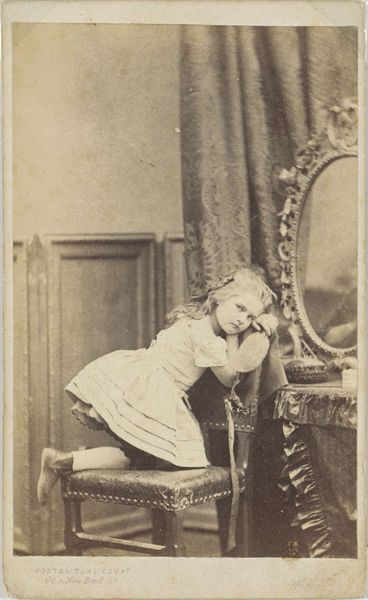 Editor: This photograph, "Encore la chaise rustique" by Pierre-Louis Pierson, taken sometime in the 1860s, depicts a young girl posed beside a rather rustic chair. I find its quiet, almost staged atmosphere really interesting. What do you see in this piece, considering its historical context? Curator: This photograph allows us to think about constructed identities within the domestic sphere, particularly concerning children and their assigned roles. Consider the girl's elaborate dress and how it contrasts with the roughness of the chair and the plain background. Is this an attempt to elevate her status or a commentary on the artificiality of class distinctions? Editor: That's a good point. It seems to almost place her in opposition to this rural aesthetic implied by the chair. Was Pierson critiquing the way children were being portrayed or groomed during this time? Curator: It's worth noting that Pierson worked within a courtly environment, so there are competing factors here. However, many children had rigidly defined roles in upper-class society during the 1860s, performing roles and upholding public image. To what extent does photography play a part in shaping our understanding of their prescribed behavior and their confined spaces? Editor: I never considered it that way, the staged aspect of the image makes me reconsider my first reaction to the setting. The way the girl is looking, she seems confined and almost longing. Curator: Exactly. What is so moving about the picture, even with its contrived affectations, is its resistance to reveal anything “natural” and true. Editor: So, by analyzing these elements, we can start to question the power dynamics and social constructs present during that time period? Curator: Precisely! Looking at historical portraits like this reminds us that art is always speaking to the social climate, and sometimes subverting it. Editor: This has given me a lot to think about. I initially saw a simple portrait, but now I see layers of societal commentary. Thanks!