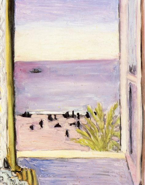 Curator: Before us hangs Henri Matisse's "The Open Window," painted in 1918. A captivating scene rendered with oil on canvas. Editor: It has a dreamy quality. The cool blues and whites...it almost feels like looking at a memory. Curator: Indeed. Painted during a tumultuous time, as the Great War neared its end, works such as this offer a powerful exploration into escapism. Think about the social and political climate of that time – how did artists respond to such a tense landscape? Editor: You're right. But I can’t help feeling the interior space, with its defined geometry, also hints at containment, despite the expansive vista. Are the subjects on the beach in the distance trapped on the other side of this divide as much as we the viewers are in here? Curator: Containment certainly becomes a theme for artists who like Matisse were working in France during WWI, who sought to represent a country struggling through wartime—one still clinging to a long held tradition of beautiful landscape art even as its people continued to struggle against global trauma. The interior space versus the outside world plays out a broader feeling in response to French involvement in the war. What’s more, it represents Matisse’s personal escape to southern France during this tumultuous period. Editor: The palm tree on the other side is evocative. The bright paint suggests warm southern Europe but its color flattens the whole background of sand and surf so everything blurs and the eye rests uneasily on the heavy foreground shadows that seem more imposing. I keep wondering about this relationship between shadows and vivid, almost unnatural color; a technique common in Fauvism. Curator: The flatness, along with those almost jarring juxtapositions of colour, speaks to a rejection of traditional artistic expectations. The Fauvist influence is palpable. It shows a deliberate choice to use color not to imitate reality, but to evoke emotion and express subjective experience. It speaks volumes about individual versus collective trauma during that time. Editor: It’s a conversation between interiority and exteriority, trauma and serenity. Thanks, I really see it now! Curator: A worthwhile exploration indeed. Thank you.