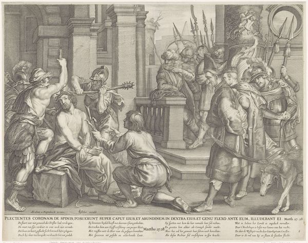 Editor: So this is a print from 1627 by Frans Brun, called "Groepsportret van Frederik Hendrik, Frederik V van Bohemen en Ernst Casimir, met hun vrouwen en kinderen". It’s a group portrait, unsurprisingly! What strikes me is how busy it is, crammed with figures. How do you even begin to unpack a composition like this? Curator: Ah, yes, "packed" is the perfect word! To me, it feels almost like a stage, doesn’t it? A very carefully constructed tableau. The architecture in the background hints at grandeur, but the abundance of detail pulls my eye in a million directions. I see families clustered almost into opposing camps on each side of the scene. Almost like two tennis teams posing for a picture. Notice how they’re placed, framed by classical columns on one side and a fantastical landscape on the other. Almost as if art is not enough, nature itself had to be styled with palaces and fountains and triumphant angels just to show who has more to be proud of. Makes you wonder about the intended audience and message, doesn't it? Who *are* these folks trying to impress? Editor: That’s fascinating – I hadn’t really considered the “stage” aspect of it. Do you think it was common for portraits at this time to have such a theatrical feel? Curator: Absolutely. It reflects the Baroque era's love of drama and spectacle, think Rubens. These weren’t just portraits; they were declarations. I suspect, looking at all those children, this image might have been a powerful piece of dynastic PR! A display of alliance as much as a depiction of family. It really draws you in doesn't it? What a powerful claim of influence! Editor: So much is being conveyed, both artistically and politically. I’ll definitely look at other Baroque portraits with this new perspective in mind. Curator: Exactly! It all starts to weave together if you approach it not only with the question "What does it look like?" but also "What did it need to be?"
