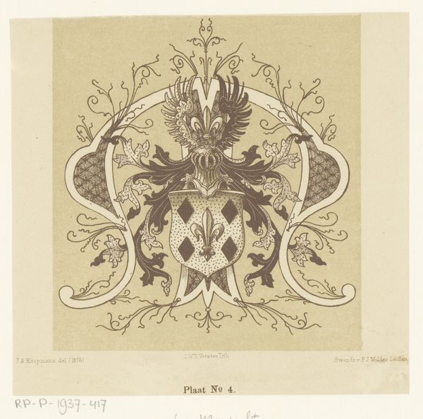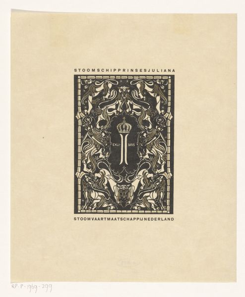 This is "Ex libris van Carel Lion Cachet," an undated print by Carel Adolph Lion Cachet. Here, black ink shapes the image against the stark white paper. Notice how the composition centres around symmetry, with heraldic lions facing each other, poised above and below the initials "CLC." This deliberate arrangement suggests a structured order, and the mirroring elements create a visual rhythm. The strategic use of black and white enhances the symbolic nature of heraldry. Lion Cachet skillfully plays with positive and negative space; the black outlines define the forms, while the white areas fill in the details, creating a cohesive and balanced composition. The year 1941 is inscribed beneath the heraldic tiger at the bottom of the image. This print invites us to reflect on the symbolic codes embedded within its heraldic design, challenging the conventional interpretations. In a world of shifting signifiers, the act of re-interpreting these visual symbols becomes a quest for meaning and a celebration of the polysemic nature of art.