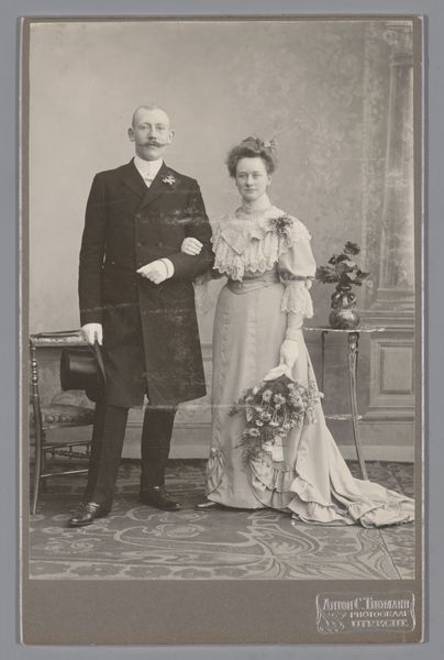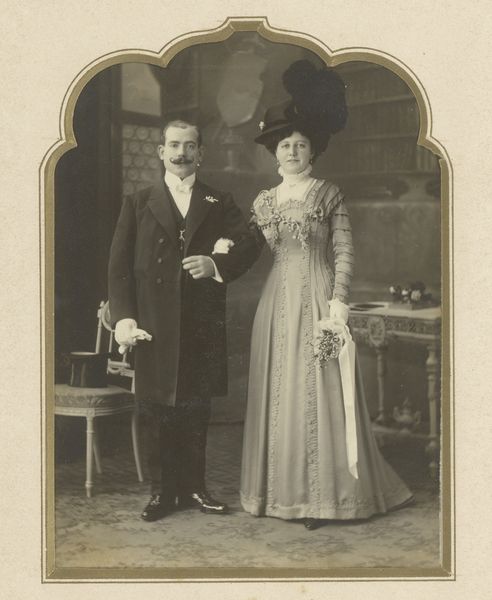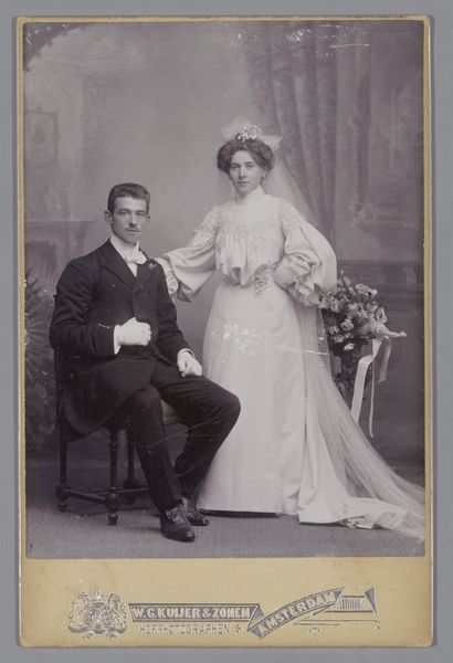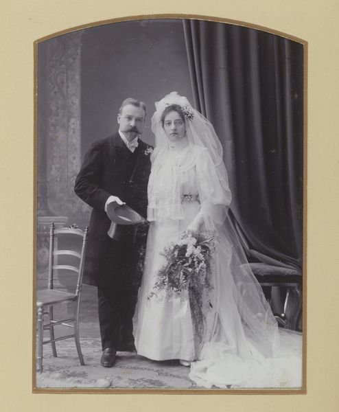 Editor: This is a gelatin-silver print, “Portret van een onbekend bruidspaar,” or Portrait of an Unknown Bridal Couple, from around 1908, by Wilhelm Janson. The formality is so striking! The dark tones create such a contrast against the white of the veil and the bride's face. What strikes you about this composition? Curator: It is indeed a very captivating composition. Notice the strict symmetry imposed upon the subjects: the almost mirror-like opposition of the bride’s dark dress and the groom’s lighter coat. It begs the question – is this photographic rigidity reflecting social constraints of the time, or a desire for balance and harmony? And how do we read the contrast in textures—the softness of her veil against the sleekness of his hat? Editor: That’s a fascinating point. It's almost as though the textures represent the traditional gender roles. Her veil being soft, hinting at fragility and then his slick hat signifying strength. It makes me wonder about their individual personalities – are they also in opposition, or in harmony, beneath the surface? Curator: Precisely. Consider how the formal elements communicate this unspoken narrative. The limited tonal range creates a certain austerity, doesn't it? Is it celebrating a union, or documenting a societal expectation? Do you think the lighting draws attention to any particular aspects of their faces? Editor: Yes, now that you point that out, the slightly softer lighting on the bride, almost romantic, draws the eye there immediately, compared to the direct light on the groom which accentuates the angles of his face and his somewhat severe mustache. The details seem carefully constructed, right down to the way he holds the hat, doesn’t it? Curator: Agreed. Even the negative space, the placement of their figures within the rectangular frame, informs our understanding. By maintaining a certain distance between them, the artist may subtly signal the complexities inherent in marriage. Editor: That’s insightful. I was focused on their faces, but now I see the whole photograph as a carefully arranged symbolic space, negotiating tradition, individuality, and perhaps a touch of unknowable personal feelings. Curator: Indeed. It’s a testament to the photograph’s power that through purely visual means, it poses so many questions, yet provides so few definitive answers.