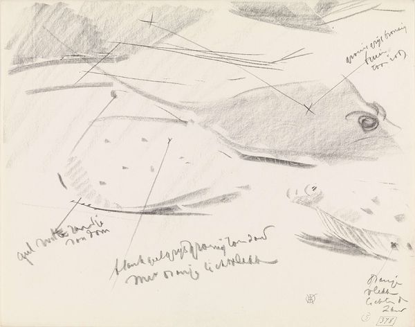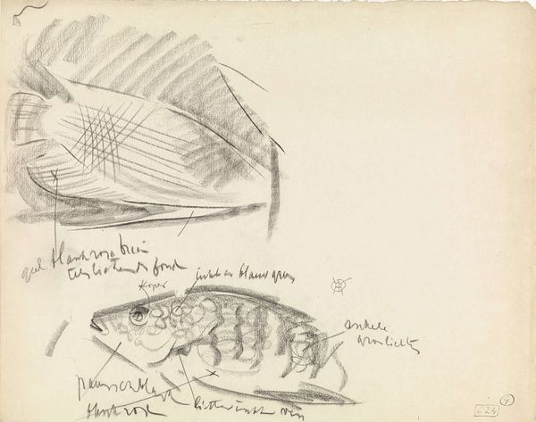 This drawing of a gurnard and two plaice with color notes was made by Gerrit Willem Dijsselhof, but the date is unknown. Dijsselhof used graphite on paper to capture these fish, and the medium itself speaks volumes. Graphite, derived from mined ore, connects this seemingly simple sketch to the industrialized world. Unlike traditional painting or sculpture, the ease and affordability of graphite democratized art-making. The study feels immediate, a quick impression recorded with a readily available tool. Notice the texture of the graphite on the paper; the soft shading brings out the form and subtle details of the fish. You can almost feel the smoothness of their skin. The artist's notations about color further enhance this sense of direct observation. Dijsselhof prompts us to consider the relationship between art, industry, and the everyday. It challenges the traditional hierarchy between fine art and craft, inviting us to appreciate the skill and artistry inherent in a humble drawing.
