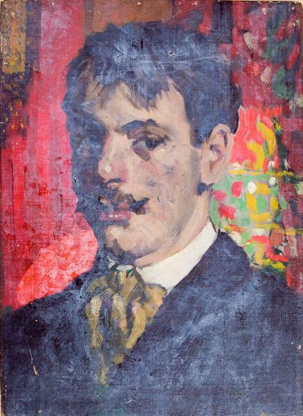Editor: Here we have Boris Kustodiev's "Self Portrait near the Window," painted in 1899 using oil on canvas. I'm struck by the direct gaze and the loose brushwork – almost like he's capturing a fleeting moment. What do you see in this piece, from your perspective? Curator: I see a careful construction of self, both literally in the brushstrokes of the oil paint and figuratively, reflecting Kustodiev's position in the late 19th-century Russian art world. The visible brushwork and materiality of the paint are crucial; this is not an attempt at pure illusion. It reveals the process. What about the context interests you here? Editor: Well, I'm thinking about the window—the framing device behind him. How does that element of the piece enhance his representation? Curator: Precisely. The window not only frames the sitter but also speaks to his connection with, or perhaps separation from, the outside world. The interior is meticulously staged, highlighting the materials of his clothing – the cut of his jacket, the quality of his linen. Think about how these choices contribute to the construction of a specific persona, potentially mediating his identity for public consumption. It shows artistic labour, his way of crafting his image. Editor: That’s fascinating – the materials as a deliberate choice to project a certain image. I hadn’t considered that. It makes me wonder if all portraiture is, on some level, a form of material culture. Curator: Indeed! This portrait really encourages us to think about the art as both an aesthetic object and the end product of considerable labour. Editor: Absolutely. Thank you; that has really changed how I view the piece.