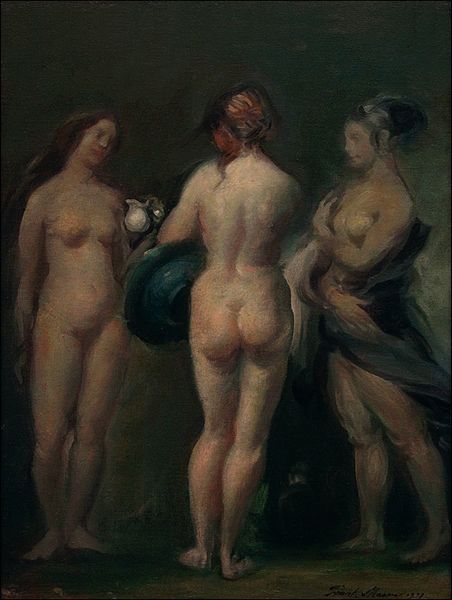 Editor: Here we have William Etty's "The Three Graces," painted around 1830, using oil paint. There’s something really striking about how he renders the figures, but what I find most compelling are the draped fabrics. What strikes you when you look at it? Curator: I immediately notice the stark contrast Etty establishes between the smooth, idealized flesh and the almost carelessly applied paint in the drapery. Romanticism favored expression and emotion over precise detail, so this feels intentional. What does that contrast say about Victorian ideals and the consumption of art? Were these women seen as commodities? Editor: That's an interesting point! So you're suggesting the materiality of the painting itself reflects how women might have been objectified at the time? Curator: Precisely. Etty's artistic process – his deliberate brushstrokes and use of costly pigments –becomes a comment on value. Consider, too, the role of the patron commissioning such a piece. Who would own this, and what does its presence signify about power, ownership, and the male gaze? Editor: I see what you mean. It's not just a depiction of beauty; it’s about who gets to possess and define beauty. Curator: And what materials were available, how were they traded? Where were the pigments sourced and what's *their* colonial history, I wonder. All these inform how we can interpret the work today. Editor: That definitely gives me a lot to think about regarding the creation and reception of art! Curator: Indeed! Examining art through the lens of its materials and context really deepens our understanding of its meaning and impact.