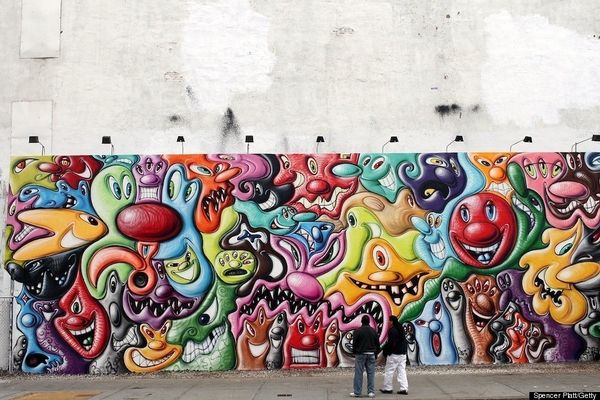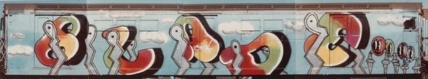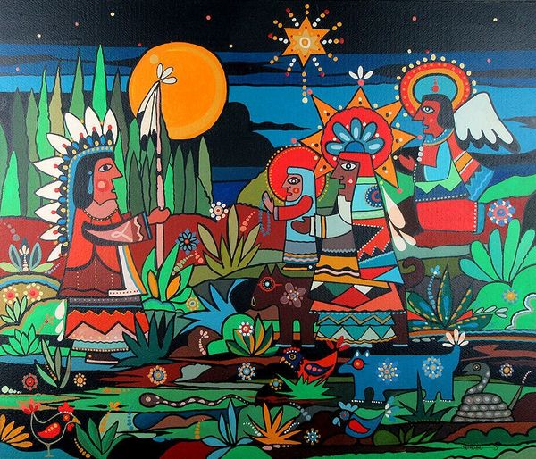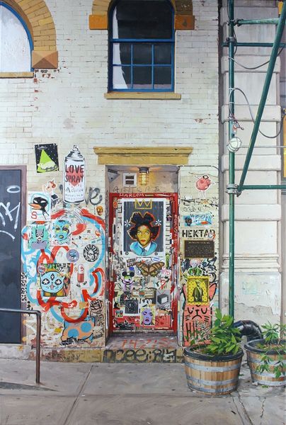 Curator: Immediately striking, isn’t it? The vibrant figures feel both ancient and utterly contemporary. Editor: It has a real presence, almost like a dream emerging from the brickwork. There’s a haunting quality to the figures in that boat, this raw expression, juxtaposed against the anonymity of the city’s architecture. Curator: Indeed. This mixed-media mural, "Kyi, Shchek, Khoriv and Their Sister Lybid," was created by Kateryna Lysovenko in 2020. It reimagines the legend of Kyiv’s founders right on the streets. Editor: Street art. And this historical reframing brings a charge. Looking at this piece I can’t help but think of gender, and power, particularly in this moment. The figure of Lybid at the helm, the only female character depicted on the vessel, almost guiding the entire group... the original legend relegated her to the background. Lysovenko elevates her into something undeniably, symbolically powerful. Curator: Absolutely. The artist uses a visual vocabulary of archetypes, referencing the medieval tradition and pre-Christian Slavic paganism. Note the simple, almost iconic depiction of the figures—almost reminiscent of early byzantine frescoes. Each color seems to embody its own elemental power and emotional energy. The boat too evokes imagery we may know from mythology - a symbolic vessel carrying them to found a new civilization. Editor: Yes, the mural as a vessel. So much street art serves to revitalize, and bring focus back to aspects of local life... It becomes more important than ever to recognize works that bring us back in touch with our stories, but now with this reframed consciousness. In the West’s popular imagination of what is a historically and culturally important image, this image pushes that. Curator: It’s a beautiful intervention into the narrative fabric of Kyiv. Lysovenko understands these figures are not just historical, but symbolic carriers of cultural identity and a national mythology. Editor: These powerful shapes have stayed with me long after seeing them. It really feels like a vital act of reclaiming and empowering the cultural narrative. A kind of rewriting of what stories matter, who gets to tell them, and in what visual language. Curator: It’s a forceful piece and an elegant articulation of history in an urban space, reminding us how potent visual symbols can be in carrying cultural memory through time.