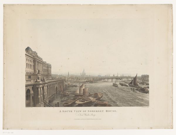 Editor: This engraving, "View of the New Bridge over the Penfeld River in Brest," by Léon Auguste Asselineau, dating from 1863-1864, depicts a bustling cityscape with impressive ships and a new bridge dominating the view. The detail is amazing! How do you interpret this work, especially considering the historical context? Curator: What I see is a deliberate assertion of modernity and industrial progress, fraught with potential for social division. The bridge itself becomes a symbol – who benefits from its construction, and whose lives are disrupted? This isn't just a pretty cityscape; it's a snapshot of 19th-century urban development, inherently tied to power, capital, and labor. Consider who is given access, represented in the foreground as passive observers of the active port workers: this scene constructs access around labor. Editor: That's interesting. I hadn’t considered it from the perspective of labor and social class. The figures do seem separate from the industry surrounding them. Does the rise of Realism, as a movement, play into that? Curator: Absolutely. Realism, in this context, can be viewed as an attempt to portray the unvarnished truth of the era. But even 'truth' is subjective. Whose reality are we seeing? Asselineau focuses on the spectacle of progress, perhaps overshadowing the impact of such changes on the working class, and also possibly occluding women from the main narratives represented. This artwork inadvertently invites a critical examination of the promises and consequences of industrialization and its effects across various groups. Editor: So, while seemingly objective, the artist's choices still reflect a particular viewpoint, or a political framing, intentionally or not. Curator: Precisely. By analyzing these choices, we can excavate the underlying narratives of the era and start crucial conversations on how we can use what art is and what it represents to impact what art can be. Editor: I never thought about it that way. Now, looking at the piece again, I see the bridge as so much more than just a bridge. Curator: And that’s precisely how art history intersects with our current understanding of power, privilege, and progress.