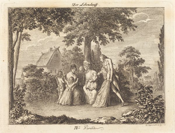 Curator: Here we have Gabriel de Saint-Aubin’s "Le Carnaval du Parnasse," an engraving and etching from around 1761-1762. Editor: The setting immediately strikes me—a theatrical gathering staged in what appears to be a classical grove. There’s something whimsical and yet meticulously posed about it. Curator: The theatrical elements are key. Saint-Aubin documented the spectacles of Parisian life, the intersections of leisure, performance, and display. It reflects the material conditions and social rituals of the aristocracy at play. Look at the rendering of the costumes and the labor involved in producing the materials! Editor: Absolutely, the textiles alone are a cultural statement. And I’m drawn to the mythological symbolism inherent in placing this scene on Parnassus, the mountain sacred to Apollo and the Muses. What's being said about the role of performance and artistry in society? Curator: The means of representing the leisure of the upper class serves to reinforce their perceived value in a rapidly shifting socioeconomic landscape. The very act of creating and consuming images like this was part of that performance, influencing public opinion and solidifying class identity. Editor: Indeed. The iconography is rich. A 'carnival of Parnassus' suggests a world where art, culture, and spectacle intersect—a temporary space of freedom, maybe? Or is it more about upholding a traditional social hierarchy through aesthetic display? Curator: Considering the historical context, the labor involved in creating even a print such as this reflects a network of skilled artisans and industry. Editor: Right. In that sense, Saint-Aubin presents both a scene of opulent festivity and, perhaps unintentionally, hints at the immense social machinery required to sustain it. Fascinating tension there, I think. Curator: It all returns to a network of skilled artisans and their labor practices to be acknowledged when examining works like this. Editor: I agree. Looking closely, the dance and drama here serve to illustrate not only a visual tableau, but something that carries far greater psychological resonance than one would suspect.