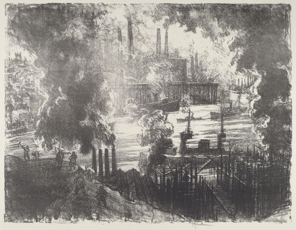 Curator: We're looking at "Changing Shifts, Charleroi", an etching created in 1911 by the American artist Joseph Pennell. Editor: The first thing that strikes me is the sheer density of it all. That smoky atmosphere presses down. Curator: Indeed. Pennell was very interested in depicting the drama of industry. He felt modern industrial scenes evoked sublimity just as much as the landscapes painted in earlier times. We can almost feel the weight of that argument, can’t we? Look at how he uses those massive vertical factory chimneys, dark against the swirling, scribbled smoke to assert human progress. Editor: To be sure, the technical mastery in evoking smoke and light through etching is considerable, right? Think of all those different bites he must have used... you get such an evocative greyscale here. But the sublime is one thing... that darkness also suggests, at least to me, the backbreaking labour. These changing shifts speak to the lived realities of Charleroi’s factory workers. The materials themselves seem to represent both potential and pollution in equal measure. Curator: You're touching on a powerful tension there. The etching style, with its rough, almost chaotic lines, is incredibly effective in suggesting movement. The artist is really emphasizing the idea of transformation and change. But if we focus for a moment on Charleroi... don’t you see that for Pennell, it becomes an emblem of modernity's darker side? Perhaps a meditation on the psychological effect of intense industrial labor. Editor: Precisely. These structures... the factories and railroads... all built by human hands from mined and forged materials are testaments to collective labor, but also, potentially, to the alienation of labor, even as these workers seek to take back the night for themselves as their shifts change. Curator: Well, I think by focusing on that interplay, between industrial growth, symbolic weight, and the real human cost represented by its material consequences, we start to appreciate how layered Pennell’s image truly is. Editor: Right. Pennell compels us to reconsider our relationship with progress itself.