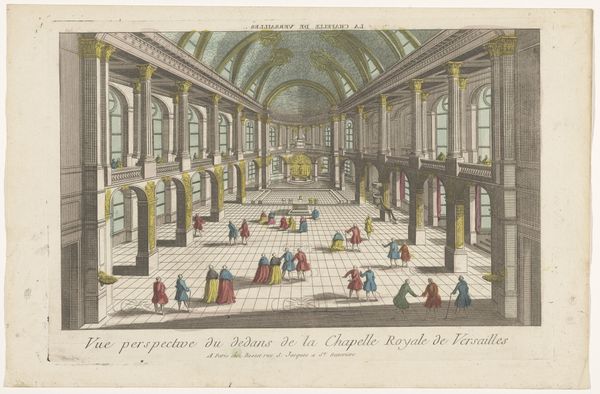 Editor: So, this is "Gezicht op het interieur van de kerk Saint Stephen Walbrook te Londen," an engraving by Robert Sayer from 1753, housed in the Rijksmuseum. It depicts the interior of a London church. What strikes me most is the overwhelming sense of order and hierarchy, even with the figures populating the space. How do you interpret this work? Curator: It's fascinating how Sayer captures the architectural ambition of the Baroque, isn’t it? This church, designed by Christopher Wren, speaks to the power structures of its time, both religious and social. Consider the perspective: the artist places us in a position to admire the imposing scale and symmetry. It's about control and conveying authority. Do you notice anything about the way the people are placed? Editor: Well, they seem almost like props, their elaborate clothes adding to the spectacle. They definitely don't disrupt the overall sense of grandeur, but what’s their story? Curator: Exactly! They represent the societal elites who would have occupied this space. This wasn't a church for everyone. It’s crucial to remember the historical context: colonialism, wealth disparity, and a deeply stratified society. Spaces like these visually reinforced those divisions. How might someone from a marginalized community at that time have experienced viewing such a scene? Editor: I never considered it from that angle. The sheer privilege on display… It definitely changes my initial perception. Curator: Precisely. Art isn’t created in a vacuum. Considering power dynamics is essential to understanding these historical works, even ones that appear simple on the surface. Editor: I see the work and its setting with completely fresh eyes. Thanks, that was illuminating. Curator: The pleasure was all mine. It is crucial to examine established works from all sides of social discourse to understand their origins and what influence they could wield in the modern age.