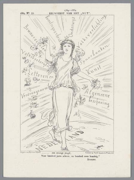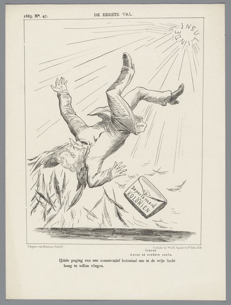 Curator: This drawing by Johan Michael Schmidt Crans is entitled "Spotprent op de deputatenvergadering van de antirevolutionaire partij, 1885," which roughly translates to "Caricature of the Deputies Meeting of the Anti-Revolutionary Party, 1885". Editor: It strikes me as almost comically theatrical, a little overwrought even. There's a definite sense of drama but in a stylized way. Is that a pile of firewood next to that cleric? Curator: Indeed. It appears to be referencing the biblical story of Abraham's sacrifice, quite directly actually, as indicated by the caption: "Abrahams offerande," or Abraham’s Sacrifice. Notice the angel figure swooping down to prevent the deed. Editor: Yes, and what a peculiar angel. The figure feels deeply satirical, inverting the typical iconography of divine intervention. Rather than a symbol of grace, there’s something decidedly…smug about it, don’t you think? Even holding a flag with words "Deputaten Vergadering" – Deputies Meeting – not typically angelic gear. Curator: The symbolism gets even richer when we understand the historical context. This caricature critiques the anti-revolutionary party's internal conflicts and leadership. The man being "sacrificed" likely represents a prominent figure, perhaps giving up his "Presidentschap"—Presidency as appears on that wood pile—for the party. The angel intervenes but represents this same group, suggesting their actions are ironically driven by self-serving interests, masking true sacrifice. Editor: Ah, I see. The piece’s brilliance lies in this visual pun: they feign sacrifice, when actually they hold on tightly to their influence. The muted tones actually enhance the biting critique of its message. There's almost a staged feel to the whole image. Curator: Precisely, this artwork shows how Crans effectively utilized religious imagery to critique contemporary political theater. A pointed commentary about faith and power of that era. Editor: It makes you appreciate the layered messages one can pack into a simple line drawing. Quite an evocative historical statement on canvas!