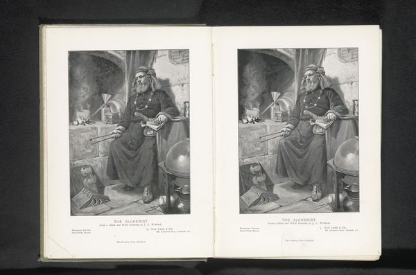 Editor: We're looking at "Sculptuur 'Dom Bazile' door Zacherie Astruc," a piece dating from before 1883. It appears to be a reproduction of a sculpture, likely through engraving and print. There's such strong contrast in the blacks and whites and the rendering of texture; I am very curious what your insights might be regarding this striking print? Curator: Indeed. The interplay of light and shadow is quite pronounced. Focusing on its formal qualities, observe how Astruc meticulously delineates the textures, juxtaposing the smoothness of the face against the intricate patterns of the background. Do you see how the composition divides the figure from the patterned background? What meaning might you derive from this, especially given the subject matter and his attire? Editor: The stark background does frame him well, but what strikes me most is the texture. How, through simple lines, is such a profound sense of depth conveyed? I suppose I'm stuck on its medium, perhaps more than its message. Curator: Consider how the medium, engraving, inherently dictates the reliance on line and shadow to create form. The artist is clearly playing with semiotics. How might one analyze the garment depicted as a symbol within the composition? Editor: That is a great question. Perhaps a symbol of rank, although he is rather dwarfed by that wall! It is incredible that the constraints of the medium become its greatest strength. Thank you, I have new ideas to consider. Curator: And I, in turn, am reminded how integral texture can be to the visual encoding of an image.