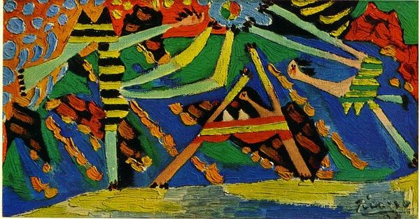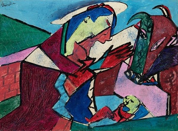 Editor: We are looking at "Man and Woman on the Beach," a 1956 oil painting by Pablo Picasso. At first glance, I see sharp angles and geometric shapes where I expect soft curves and contours. What do you see in this piece, beyond just figures on a beach? Curator: Oh, darlings, this isn't *just* figures, this is Picasso being, well, Picasso! Imagine sunlight fracturing across the sand, and the way heat shimmers distort reality; he's caught that energy here. The hard edges you noticed? They speak to a deeper structural truth, stripping the scene down to its raw essence. It's like he's showing us the blueprints of a beach day, wouldn’t you agree? Editor: I hadn't thought about it that way, but now I can see how it does capture the feeling of a hazy, hot day. Are those triangle shapes supposed to represent beach tents, or are they something more abstract? Curator: Perhaps! I believe the interpretation should be as multifaceted and multifaceted as a gem. Tents are there as shelters; you know as well as I do the significance of protection when sunbathing. Also, the very form resembles simplified facets in analytic Cubism as Picasso once did, which he is referencing in an almost retrospective nod. The figures themselves seem more symbols of humanity than actual portraits. This also connects with Pop Art using accessible visual languages as an attempt to mass produce fine art. Editor: That's so interesting. The way he blends abstraction with recognizable forms… it almost feels like he's inviting us to reconstruct the scene in our own minds. Curator: Precisely! It's a collaborative experience, darling. The canvas becomes a mirror reflecting our own interpretations, fears, dreams and aspirations. He's left space for us to play in the sandbox of his mind! I can sense you want to agree, my friend! Editor: Absolutely! I'll never see a beach the same way again.