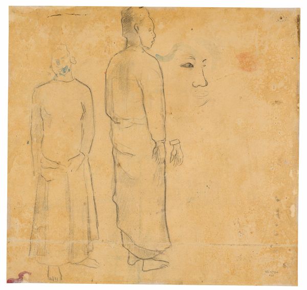 Editor: This is Paul Gauguin's "Ten Studies of Tahitian Figures," created between 1891 and 1893. It’s a collection of ink and watercolor sketches on paper. What strikes me is how ephemeral they feel, like glimpses into everyday life. How do you interpret this work within the context of Gauguin's time in Tahiti? Curator: Gauguin's Tahitian works are undeniably beautiful, but we have to view them through a critical lens. His vision was deeply entangled with colonial power dynamics and romanticized notions of the "exotic." How might these "studies" reflect Gauguin’s gaze, and perhaps misrepresent the lived experiences of Tahitian people? Editor: So, instead of an objective representation, these sketches might reveal more about Gauguin's own preconceptions? Curator: Exactly. Consider the power imbalance at play. Gauguin, a European male artist, is observing and documenting Tahitian individuals, potentially stripping them of agency in the process. The sketch-like quality you noticed could also imply a fleeting, superficial understanding. Where do you see evidence of this in the figures themselves? Editor: Well, some faces are barely defined, almost ghost-like, which could suggest a lack of real engagement with them as individuals. Curator: Precisely. And think about the Western art historical tradition of "studying" the figure. Whose gaze is centered here, and at what cost? It encourages us to deconstruct these idealized portrayals and ask ourselves: what narratives are being left out? Editor: That makes me rethink the piece entirely. I was initially drawn to the beauty, but I now see the need to question the colonial context shaping it. Curator: Indeed. By interrogating these images, we can challenge dominant narratives and amplify the voices of those who have been historically marginalized.