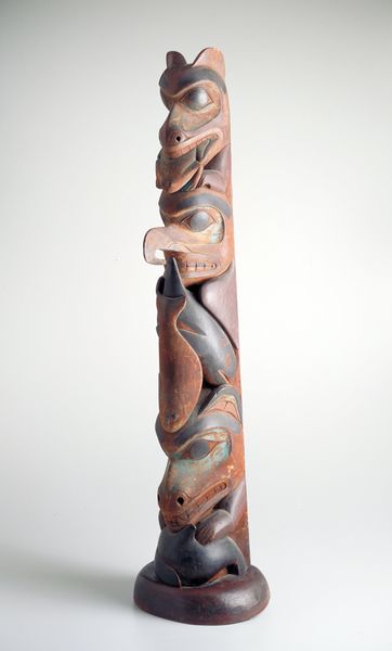 Editor: We're looking at a Gurunsi mask, crafted around the 1930s. It's made of wood and pigment, and it just exudes a raw, powerful energy. The geometric patterns and the overall structure – what do you make of it? Curator: It strikes me as something of a visual poem. You've got these bold shapes, these stark contrasts between red and cream and black – it's almost a shout, isn’t it? I feel a very definite... *presence*. These masks were rarely about pure aesthetics. Imagine the dance, the drums, the incantations – a sensory explosion designed to connect with the spiritual world. Think of it as a carefully crafted portal. What do you suppose those triangles might signify to the Gurunsi people? Editor: Is it too simple to say they might represent, like, village boundaries, or protection? Curator: Not at all. It could be anything from cosmological symbols to family emblems. Here's a funny thing. To *us*, a triangle is just a shape. But imagine growing up steeped in a culture where it carries real, tangible *power*. Shifts the way you perceive the world, doesn’t it? Almost like suddenly seeing in color, when you only knew black and white before! Editor: Definitely. It makes you think about the limitations of our own interpretations, how much context we might be missing. Curator: Precisely! It is less about 'understanding' a mask like this, more about *feeling* its resonance, its connection to something bigger than ourselves. It hums, doesn’t it? A tangible piece of human expression from so very long ago. What stories do you think it could tell? Editor: Stories of ritual, belief, and a really different way of seeing. I think I see this mask, and masks in general, differently now!