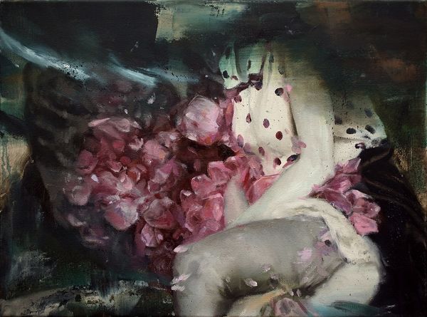 Joshua Flint’s painting “Synchrony” invites us into a world where human emotion and the natural world intersect. Here, a woman adorned with a crown of flowers covers her eyes as hummingbirds flutter around her. Flint’s work often explores themes of identity, memory, and the search for meaning in a complex world. In this piece, the woman's gesture suggests vulnerability or introspection, while the hummingbirds—symbols of joy and adaptability—create a sense of dynamic energy. Is this joy or burden? The birds appear to hover above her, suggesting an alternative narrative that offers a sense of freedom. The title, “Synchrony,” hints at a deeper connection between the woman and her environment. The woman's face is hidden from the viewer, inviting a sense of introspection. Perhaps this piece is more an exploration of the complex internal state of the artist, a mirror of our own search for solace and connection amidst life’s challenges.