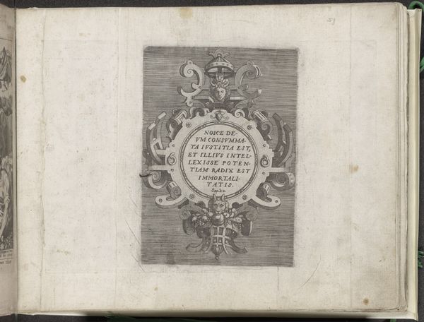 Editor: So, here we have a print titled "Cartouche met een tekst uit het Bijbelboek Johannes," created in 1555 by Frans Huys. It's currently housed in the Rijksmuseum. It feels almost secretive, like a hidden message on aged paper. I am fascinated by the frame, though... What symbols can we unearth in this piece? Curator: This cartouche, beyond simply displaying text, functions as a vessel carrying deeply embedded cultural memory. Consider the very act of framing – what does it separate, what does it emphasize? The grotesque faces, the classical figures…these aren't arbitrary decorations. They speak to the tension of the Reformation. Editor: Reformation tension, you say? Can you elaborate? Curator: Observe the central text— a quote from the Gospel of John: "For God so loved the world..." This message of salvation is encased by visual motifs from both pagan antiquity and grotesque imagery. In this piece, Frans Huys attempts to reconcile classical learning with Christian doctrine. Are these contrasting elements in conflict or in conversation? Editor: I never thought of it that way. I see a bunch of ornaments, but the interplay reveals something about intellectual currents of the time. Almost like an argument rendered in visual form! Curator: Exactly. Each choice – the lettering style, the ornamentation – it contributes to a broader dialogue about faith, reason, and the changing world. Think about how printmaking itself allowed for wider dissemination of such complex ideas. This piece, though small, is an archive of its time. Editor: So, this small print encapsulates some pretty big tensions! I am blown away about all it can reveal about its cultural environment. Curator: It serves as a reminder that images aren't neutral; they carry emotional, cultural, and theological baggage.