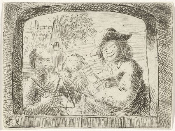 Simon Klapmuts created this etching, "Rommelpotspeler en twee kinderen in een nis" which translates to "Rommelpot Player and Two Children in a Niche". The image offers a glimpse into the lives of the common folk of his time. We see a musician playing a Rommelpot, a traditional instrument, accompanied by two children. The niche setting suggests a sense of enclosure. What is striking is the raw, unidealized portrayal of the figures. These are not the polished faces of the elite but rather the weathered visages of those who lived a life of work. There is a strong sense of community, a reminder of shared experiences. The smiles on their faces is inviting, it draws us in. The emotional connection here transcends class boundaries, inviting us to consider the shared humanity. In a time of strict social hierarchies, Klapmuts' choice to depict the lives of everyday people humanizes the poor, challenging conventional societal norms. This etching reminds us of the power of art to bridge divides and offer alternative perspectives.