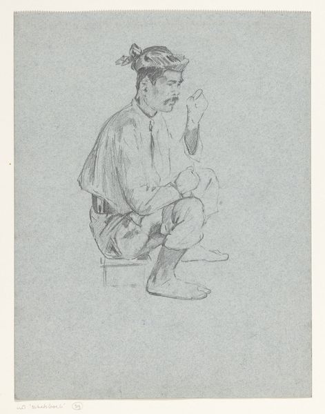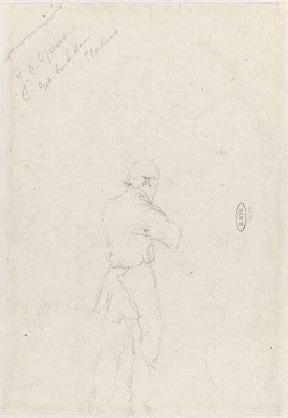 Curator: Here we have "Standing Man with Extended Arm" by Richard Nicolaüs Roland Holst, created in 1903. It's currently held here at the Rijksmuseum. Editor: Immediately, I'm struck by its raw quality. It's a simple pencil drawing, yet it possesses this incredible presence. It almost feels like a captured moment. Curator: Exactly. Look at the type of paper Holst is using – a readily available sketch paper, nothing fancy. The pencil work is economical, focused. This isn't about creating a highly finished product; it's about documenting a moment, a posture. It feels immediate and unfiltered. Editor: Considering the period, I wonder about the figure’s social class. His clothing – a simple cap, open-necked shirt, and what look like work trousers – speaks volumes. It makes me wonder about the role of the working class at the beginning of the 20th century in the Netherlands and whether Holst intended to valorize the laboring body. Curator: That's astute. Holst was part of a movement interested in craft and labor. Consider the relationship between artist and subject—did Holst know this man? What labor might this pose suggest, reaching towards a horizon of change, or simply a casual moment of repose? It prompts reflection on labor, artistic process, and what exactly makes an image worthy of our attention. Editor: The gesture, with his arm extended, could signify invitation or demand. It's really quite ambiguous. Looking closely at the detail of the drawing, you see how Holst captures this feeling by using thin lines, capturing subtle expressions and textures. Curator: Notice too how Holst isn't necessarily aiming for photorealistic accuracy. The proportions are slightly off, but that only adds to its charm. I imagine he probably produced many images like this—learning by practicing. Editor: Absolutely, that imperfection brings intimacy. It allows us to connect with the figure not as a historical figure, but as someone accessible. Curator: By thinking about process, materiality, and its socio-historical roots, we glean more than the visual facts presented. Editor: Ultimately, this drawing allows us to speculate and weave histories, reminding us of the social narratives imbued in the simplest forms of art.