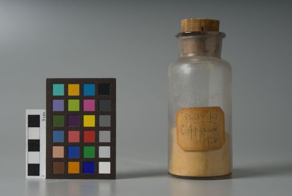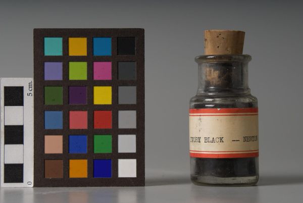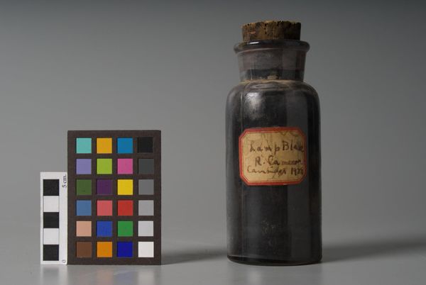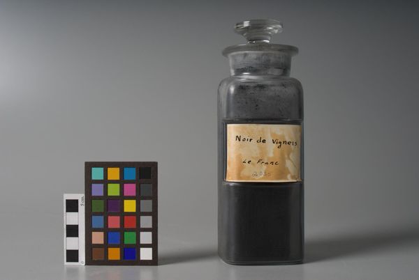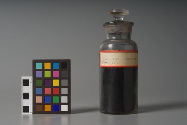Editor: Here we see "Lamp Black," made by F. Weber & Company. It’s a simple bottle filled with pigment, a stark reminder of art’s raw materials. What meanings do you find in this seemingly basic object? Curator: This isn't just pigment; it's a marker of labor, extraction, and industrial processes. Who mined the materials? How did it become this refined substance? The bottle itself becomes a container of complex histories, doesn't it? Editor: I hadn't considered the layers of labor involved. Curator: Think about the cultural implications of "blackness," too. How does this pigment, labeled and contained, reflect historical associations with darkness, otherness, or even power? This simple object invites questions about material culture and systemic inequalities. Editor: It makes me think differently about the art-making process and its larger implications. Curator: Exactly. It's a potent reminder that even the simplest elements carry loaded histories.