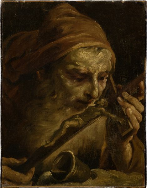 Curator: Bartolomeo Passerotti's oil painting, "Grotesque Man who plays a Lute," dates back to about 1580. It offers a glimpse into the late 16th-century artistic sensibilities. Editor: Whoa. Intense first impression. The lute player's face is… well, he's certainly unique-looking. But something about it also makes me smile; maybe it’s the slightly desperate look in his eyes combined with the flowers in his hat! Curator: It's definitely a caricature, leaning into genre-painting tropes that would've resonated with a particular segment of the market then, exploring exaggerated features and possibly poking fun at societal types through visual puns or comedic commentary. What strikes me, though, is the quality of the materials-- pigments available, canvas weave – how do these shape the final work? Editor: Right, right, the materials and process. Sorry. I keep getting caught up in his expression. Seriously though, it’s like a distorted mirror of humanity – poking at vanity, you know? But in the end, it reminds me of all of us: desperately looking for a creative outlet or at least a free glass of wine. He’s got one sitting right there, right? Curator: It is striking how the setting around the man provides hints. A full ewer of drink and wine are near, and even his canine companion enjoys a hefty loaf. These additions can be understood by analysing the social functions around taverns or comedic theatre – perhaps indicating not only the making, but purpose. Editor: Totally, a sense of humor laced with social awareness, it’s definitely there! Plus, technically speaking, it shows a certain mastery, using dark oil paint layering, you get an incredible sculptural feel to his face. A painter playing around with what it means to be alive and flawed, you dig? Curator: Precisely, the layering indicates time but also access; not just any artist could conjure up and utilize such dense layers. Reflecting on Passerotti's technique illuminates not just craftsmanship but an aspect of commodity within art creation itself, how its history echoes. Editor: Absolutely. And it reminds me that making art, real art, means being brave enough to confront ugliness and maybe finding something beautiful hiding inside of it, right? This work definitely does just that, turning that raw feeling into a little slice of life on the canvas.