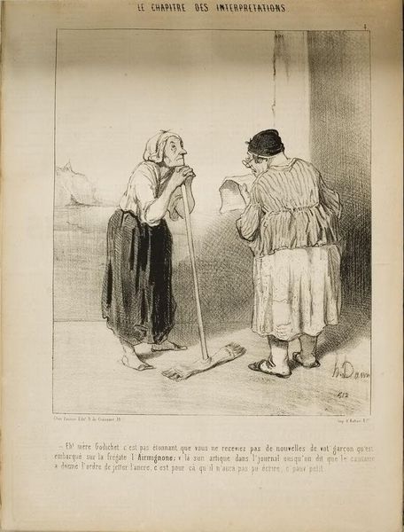 Curator: This print by Honoré Daumier, titled "Hey, old lady Godichet, it's not surprising..." presents two older women engrossed in conversation. The simplicity of the materials makes it feel very immediate, very raw. Editor: It’s stark, isn't it? The lines are so sharp, highlighting their aged faces and worn clothing. It speaks to a hardscrabble life. Curator: Daumier was a master of lithography, a process that allowed for relatively quick and inexpensive reproduction. Prints like this could reach a wide audience. Editor: And the inscription at the bottom offers a biting commentary on class and communication. The news of a captain's recklessness explains the lack of letters from a son at sea. Curator: The print becomes a powerful critique of social structures and the value—or lack thereof—placed on the working class. Editor: Absolutely, and the materiality of the print itself, its mass production, underscores the commodification of news and suffering. Curator: It gives us a glimpse into the daily realities and anxieties of 19th-century France. Editor: Yes, Daumier's print gives voice to the anxieties of a society undergoing rapid change.