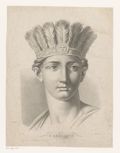 This print of the bust of Juno was created by Louis Charles Ruotte, though the date remains unknown. The print captures the bust of the Roman goddess Juno with neoclassical precision. Ruotte employs fine lines and subtle shading to create a smooth surface that seems to almost glow from within. The composition centers on the goddess's serene face, framed by a simple headband and delicate curls, evoking a sense of classical grace. The artist's formal treatment emphasizes clarity and idealization. The goddess’s gaze is cast downward, with her expression conveying a contemplative mood. By focusing on her smooth skin, defined cheekbones and closed eyes, Ruotte draws our attention to her serene countenance. This emphasis on formal qualities serves not only aesthetic purposes but also reflects broader cultural values. The artwork invites ongoing dialogue and reinterpretation as we continue to grapple with the meanings of beauty, divinity, and representation.